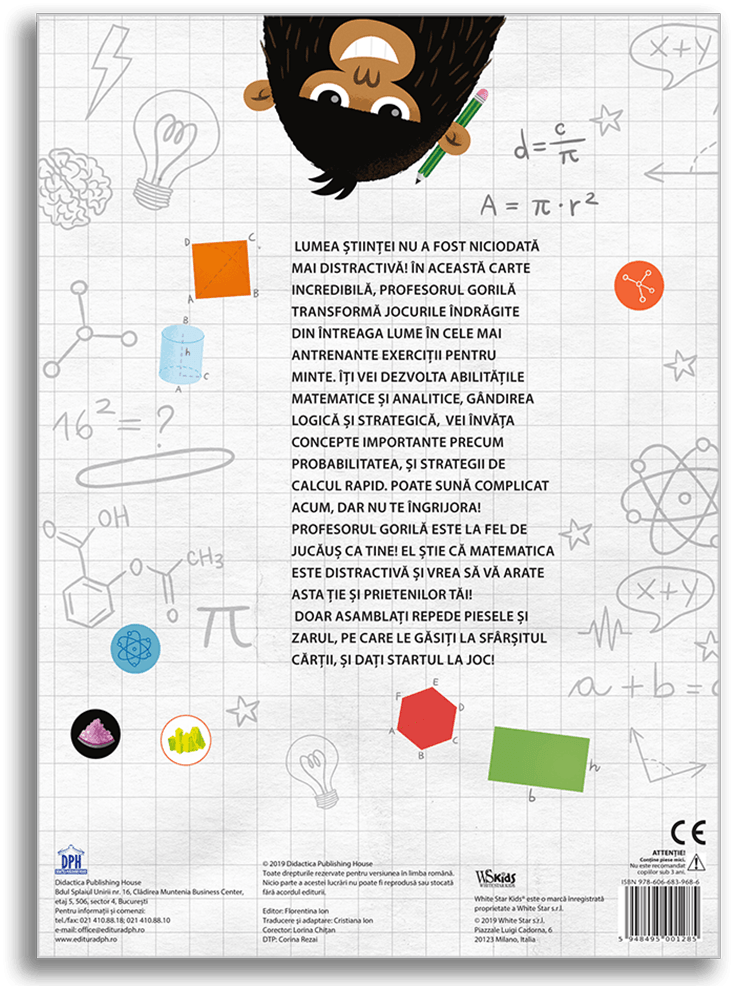 Lumea stiintei nu a fost niciodata mai distractiva in aceasta carte incredibila. Profesorul Gorila transforma jocurile indragite din intreaga lume in cele mai antrenante exercitii pentru minte. Iti vei dezvolta abilitatile matematice si analitice, gandirea logica si strategica, vei invata concepte importante precum probabilitatea si strategii de calcul rapid. Poate suna complicat acum, dar nu te ingrijora! Profesorul Gorila este la fel de jucaus ca tine! El stie ca matematica este distractiva si vrea sa va arate asta tie si prietenilor tai! Doar asamblati repede piesele si zarul, pe care le gasiti la sfarsitul cartii, si dati startul la joc!