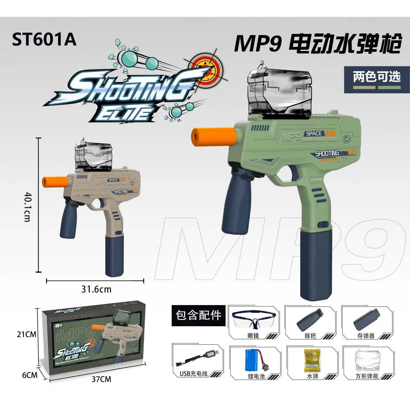 Pistol electric Flippy cu bile de hidrogen de gel, ochelari de protectie, 5000 de bile incluse, cablu de incarcare, 40.1 x 31.6 cm, Mp9, verde