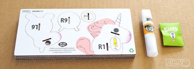 28 carduri care contin piesele necesare pentru construirea unicornului