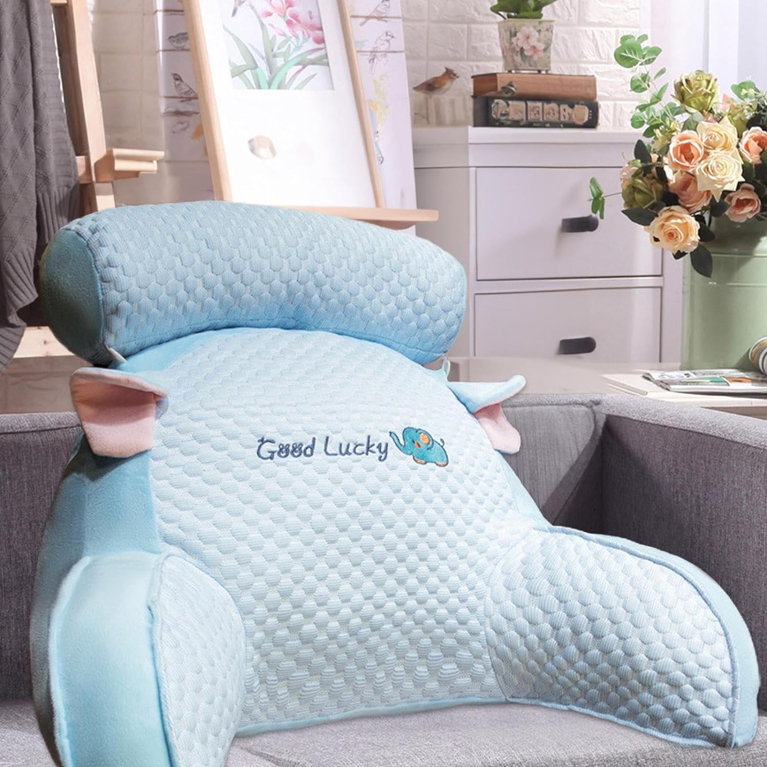 Perna Multifunctionala, Flippy, Spatar pentru Pat, Protectie Lombara, Marime Medie, 60 x 40 cm, din Plus, Model Elefant, Albastru