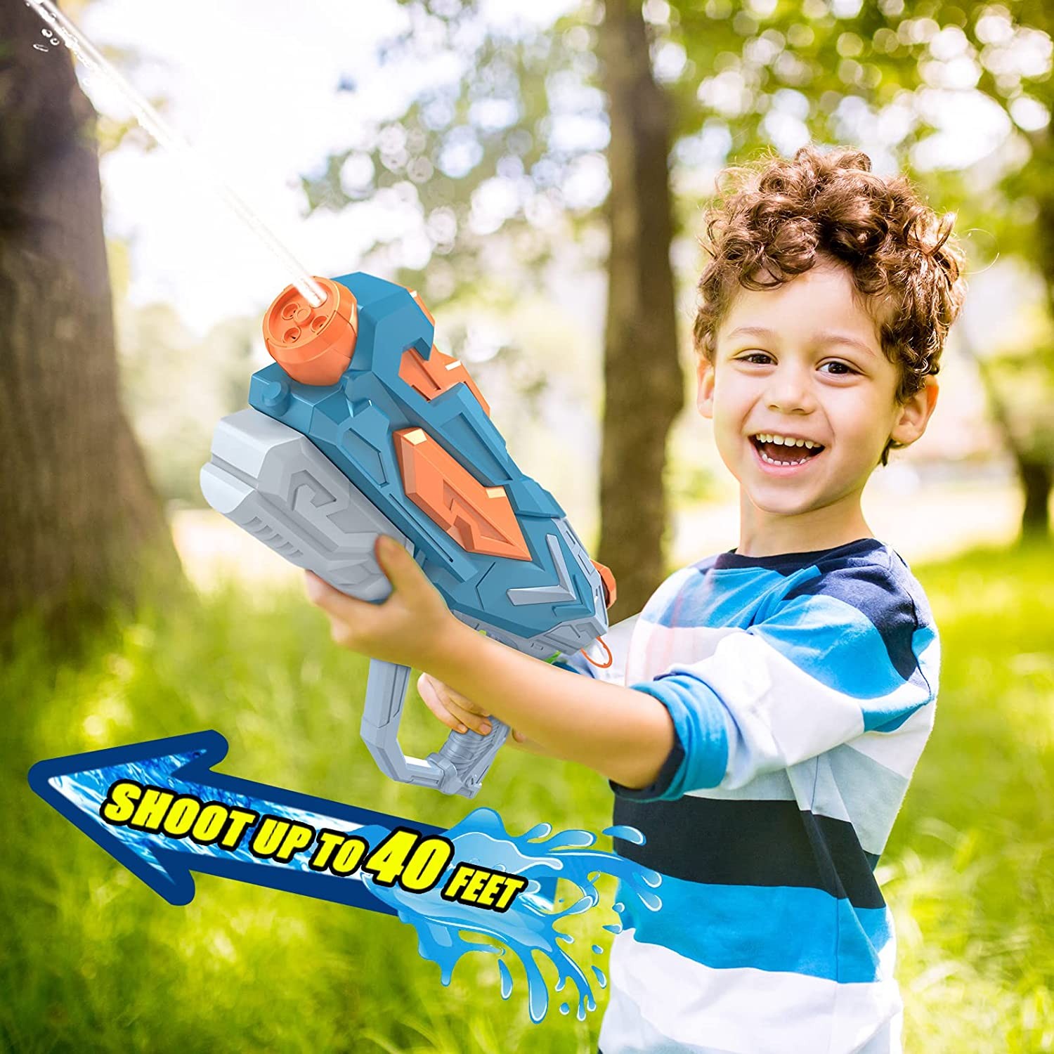Pistolul puternic de apă adoptă designul pompei de înaltă presiune.Ușor de umplut și operat! Vă rugăm să evitați să trageți direct în față și în ochi. Designul rezistent la scurgeri permite copiilor să se joace fără să-și facă griji că apa se poate scurge.