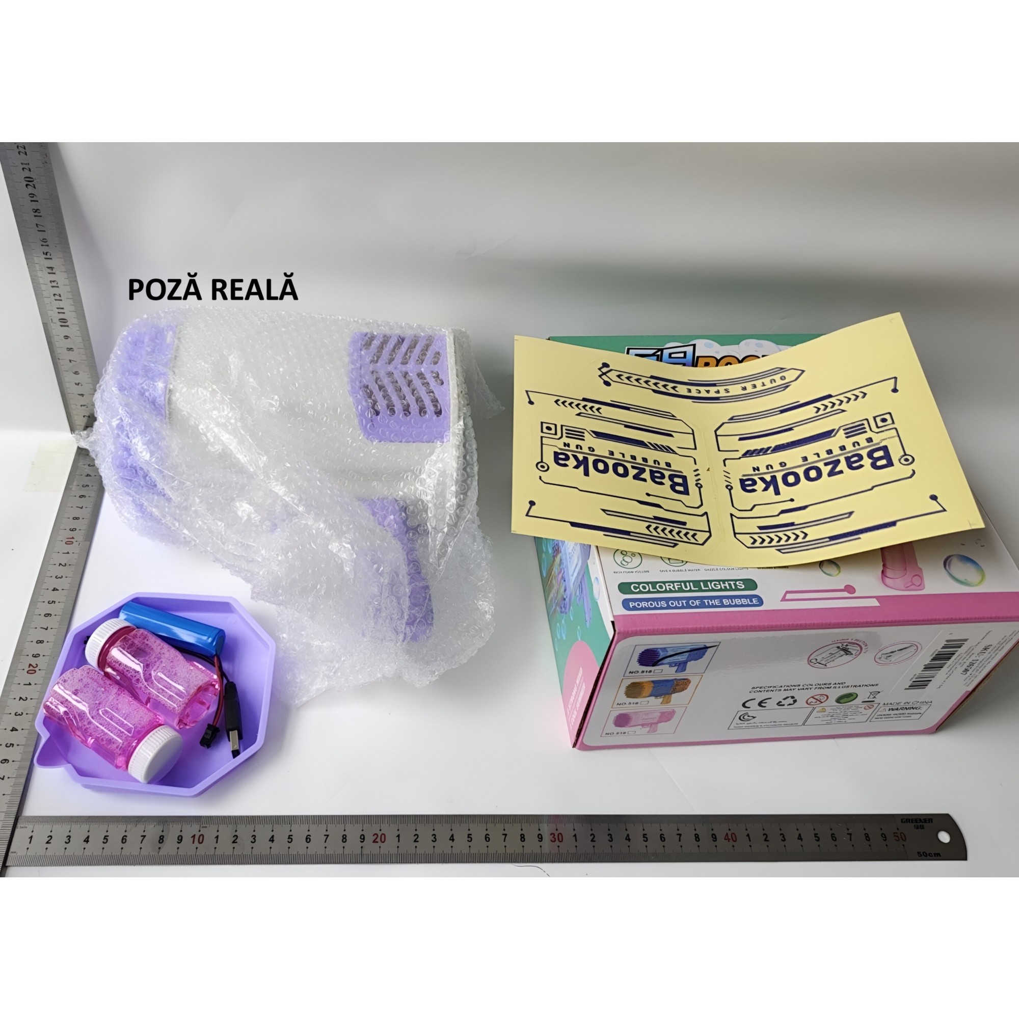 O mulțime de baloane de săpun Pistolul pentru baloane de săpun poate pulveriza peste 7000 de baloane colorate care zboară către cer în fiecare minut. Când apăsați pe trăgaci, vor fi lansate baloane, iar țeava se aprinde.
