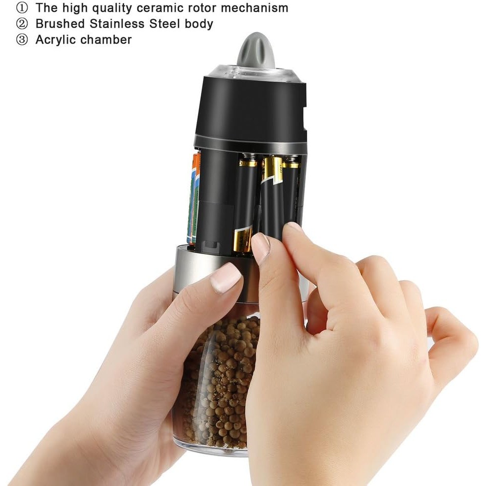 Cameră de Depozitare Transparentă: Designul său inovator include o cameră de depozitare transparentă, care îți permite să vezi cantitatea de condimente rămase și să reumplești cu ușurință atunci când este necesar. Astfel, nu va mai trebui să te întrebi niciodată când este momentul să adaugi sare sau piper.