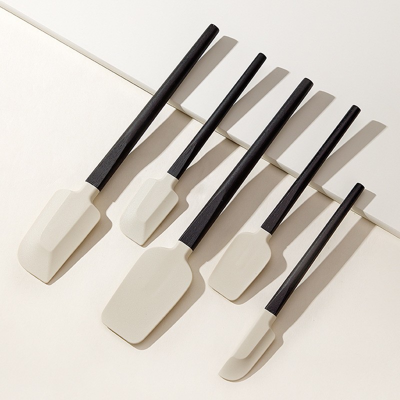 Set 5 Ustensile de Bucatarie, Flippy, din Silicon si Lemn, Spatule de Diferite Dimensiuni, Termorezistente, Antiaderente