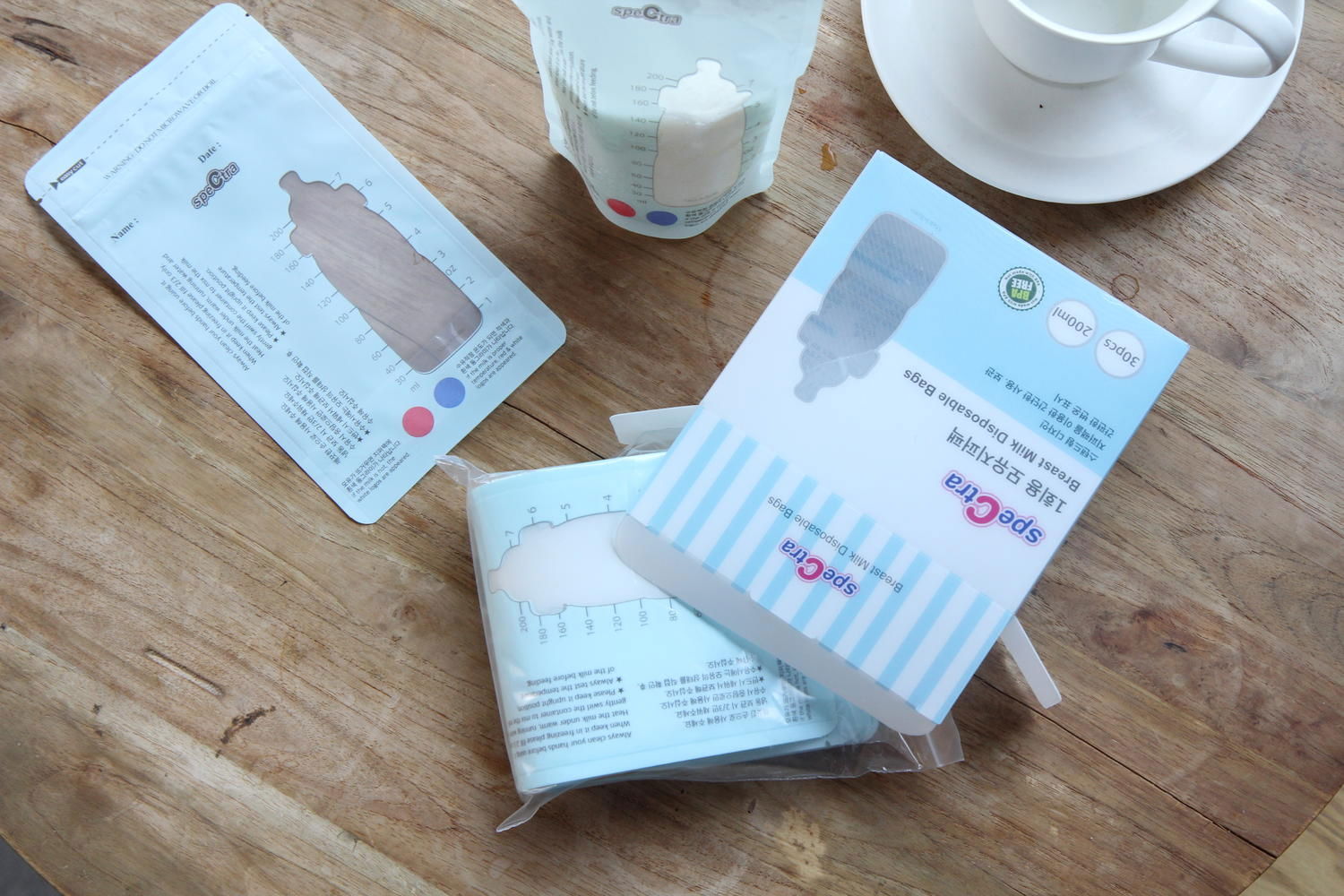 setul contine 30 de pungi pentru stocarea laptelui matern cu fermoar, avand o capacitate de 200 ml fiecare