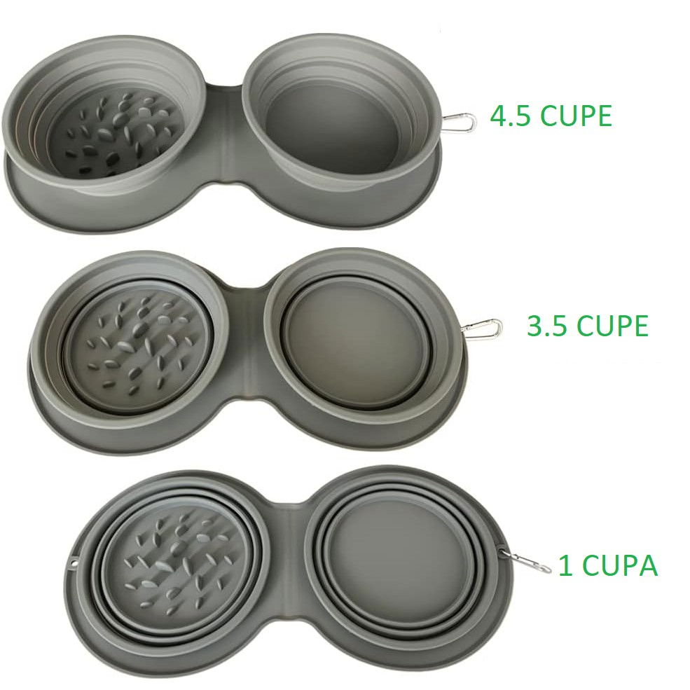 Bol Dublu pentru Animalul de Companie, Flippy, din Silicon, Pliabil, Inaltime Reglabila, Antialunecare, 42 x 21 x 5 cm, Gri