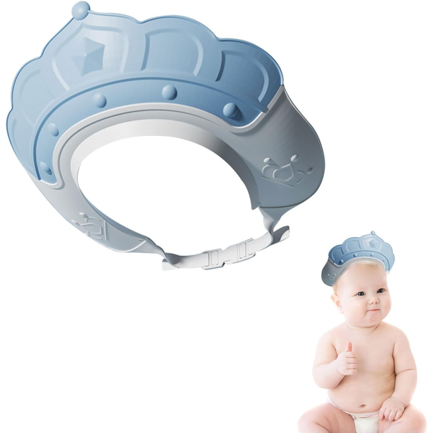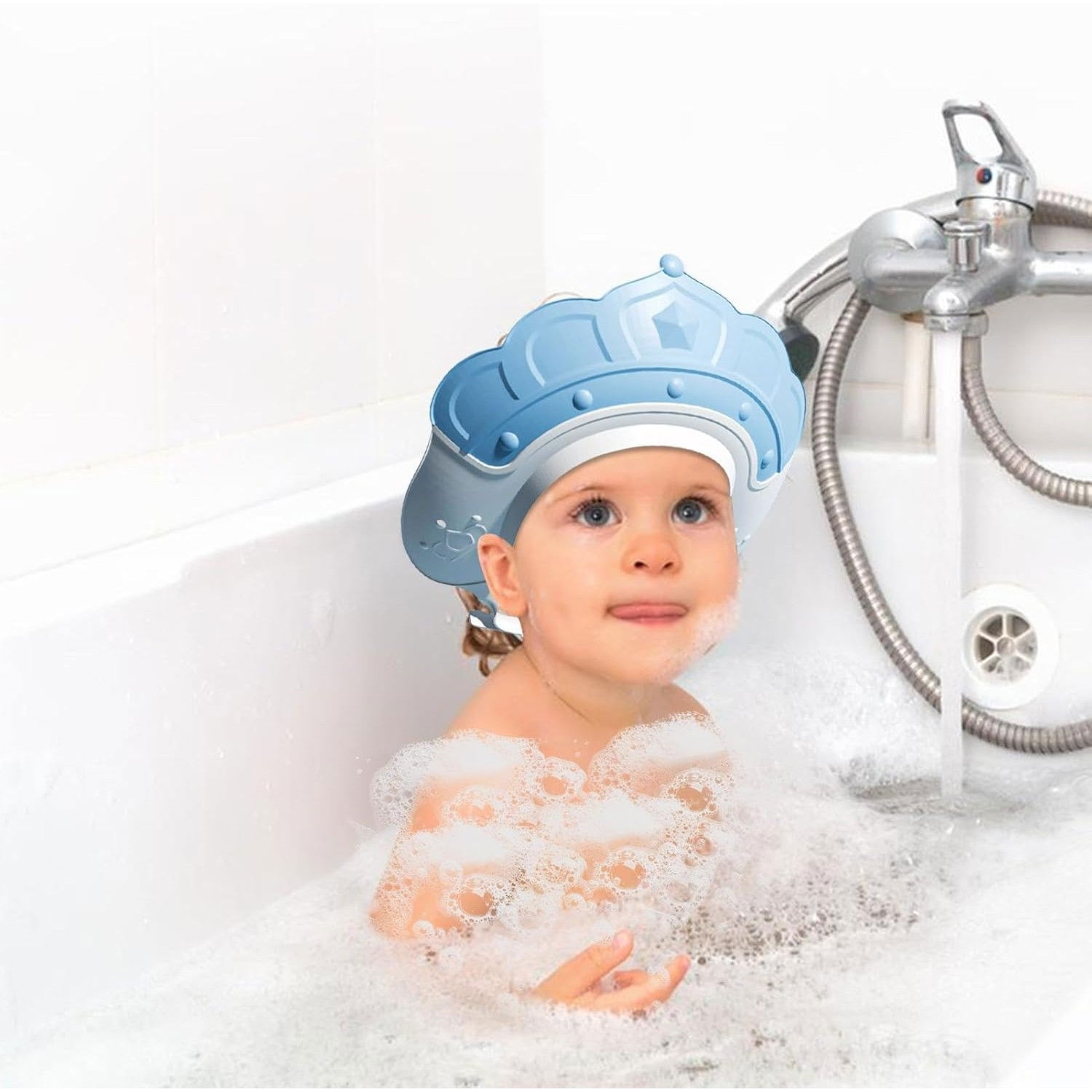 Casca de Dus, Flippy, Previne Scurgerea Apei si Samponului pe Fata, 0-12 Ani, Ajustabila, din TPE+PP, 20 x 23 cm, Model Coroana, Albastru