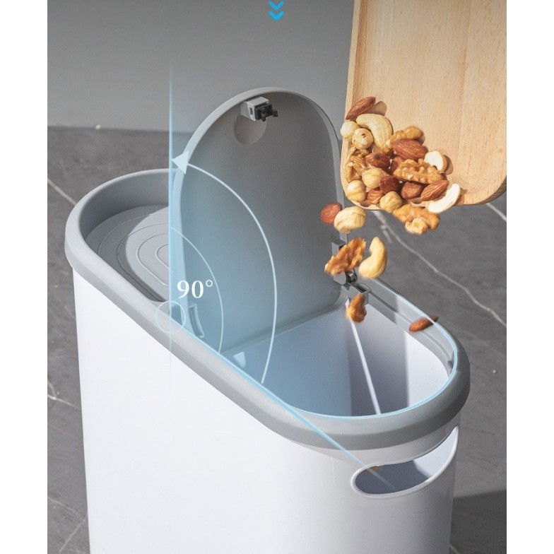Dotat cu capac pop-up cu un singur buton, acesta se deschide rapid prin apăsare și se ridică la un unghi de aproximativ 90°, oferind acces facil și igienic. În partea superioară dispune de un compartiment practic de depozitare, perfect pentru saci de gunoi, hârtie sau alte accesorii mici.