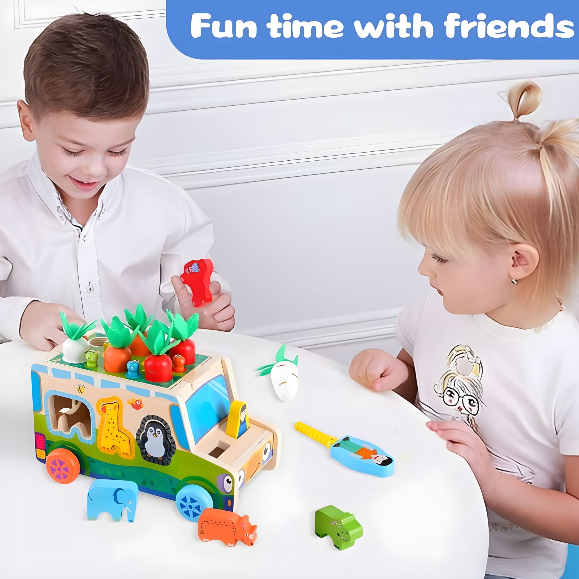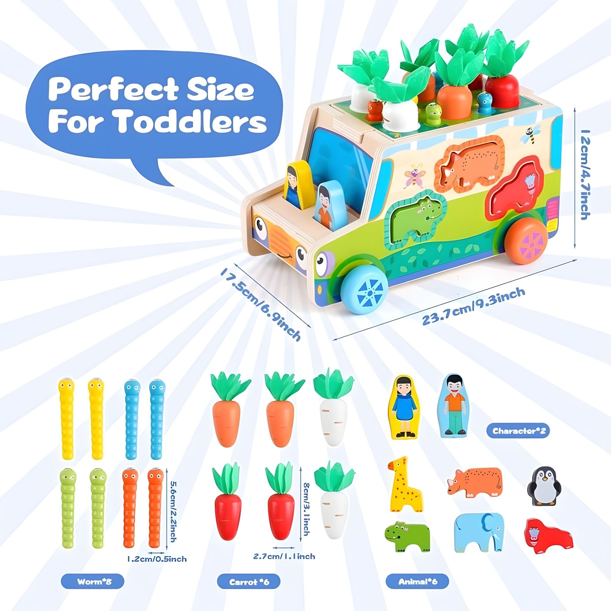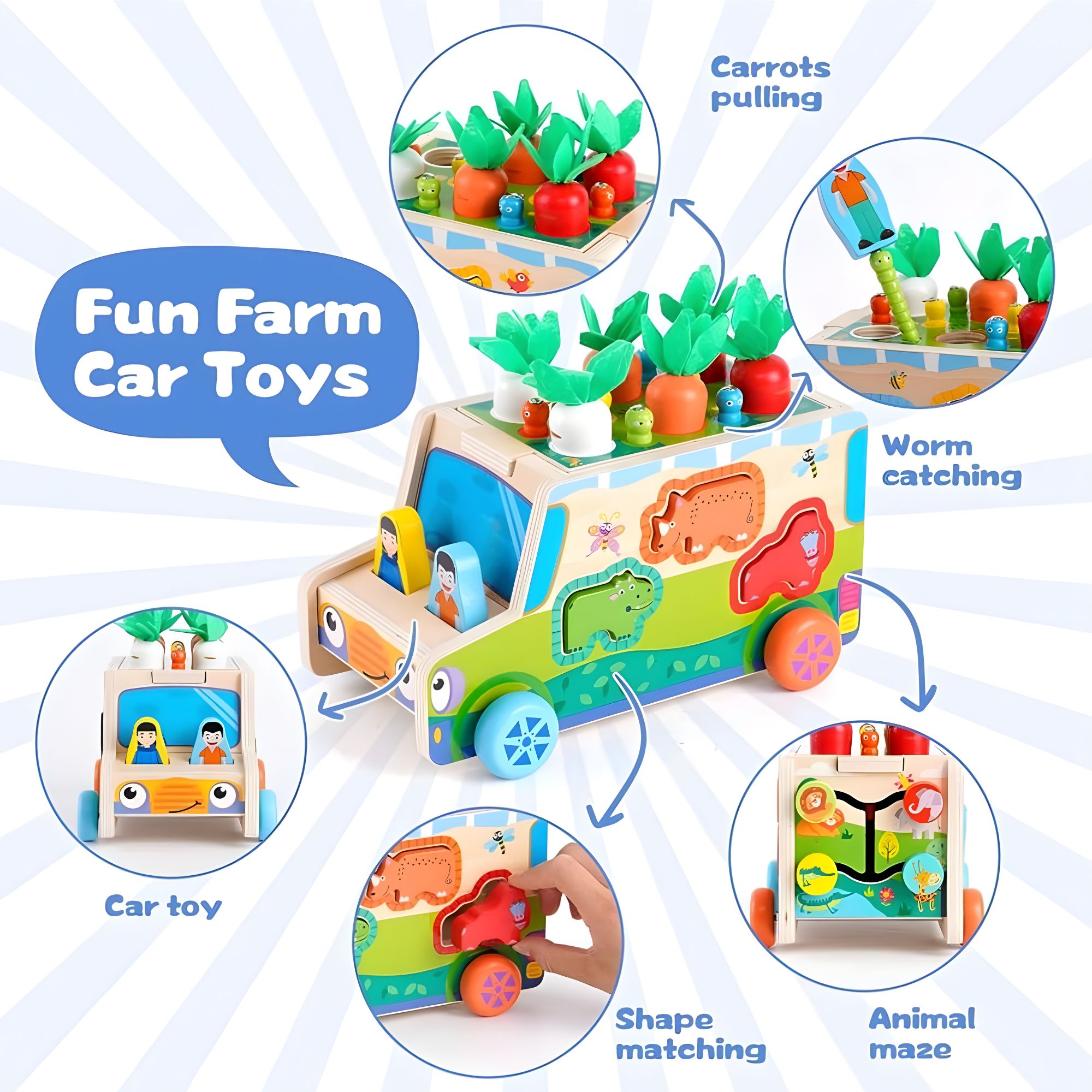 Jucăria Montessori Flippy 6-în-1 este o mașinuță educativă din lemn, creată pentru copii mici (1–3 ani), care combină mai multe activități într-un singur set. Copilul poate scoate morcovi, poate prinde viermi cu ajutorul pieselor magnetice, poate potrivi animalele în sortator, poate explora labirintul și poate folosi mașinuța ca jucărie de împins/transport.