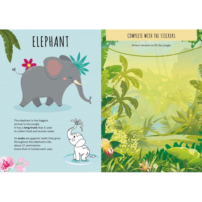 Cartea contine: pagini de colorat cu tigri, maimute, papagali, elefanti si alte animale exotice, care dezvolta simtul estetic si creativitatea, labirinturi captivante si provocatoare, menite sa imbunatateasca gandirea logica si spiritul de observatie, jocuri de logica, 60 de abtibilduri viu colorate, perfecte pentru decorat si completat activitatile din carte si multe informatii amuzante si educative despre vietuitoarele din jungla – prezentate intr-un mod simplu si accesibile copiilor