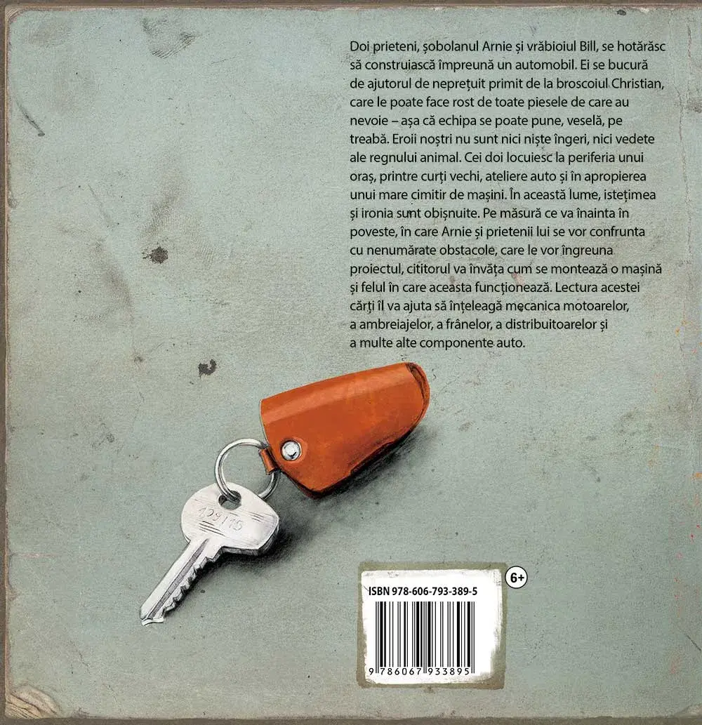 Doi prieteni, sobolanul Arnie si vrabioiul Bill, se hotarasc sa construiasca impreuna un automobil. Ei se bucura de ajutorul de nepretuit primit de la broscoiul Christian, care le poate face rost de toate piesele de care au nevoie – asa ca echipa se poate pune, vesela, pe treaba. Eroii nostri nu sunt nici niste ingeri, nici vedete ale regnului animal. Cei doi locuiesc la periferia unui oras, printre curti vechi, ateliere auto si in apropierea unui mare cimitir de masini. In aceasta lume, istetimea si ironia sunt obisnuite. Pe masura ce va inainta in poveste, in care Arnie si prietenii lui se vor confrunta cu nenumarate obstacole, care le vor ingreuna proiectul, cititorul va invata cum se monteaza o masina si felul in care aceasta functioneaza. Lectura acestei carti il va ajuta sa inteleaga mecanica motoarelor, a ambreiajelor, a franelor, a distribuitoarelor si a multor alte componente auto.