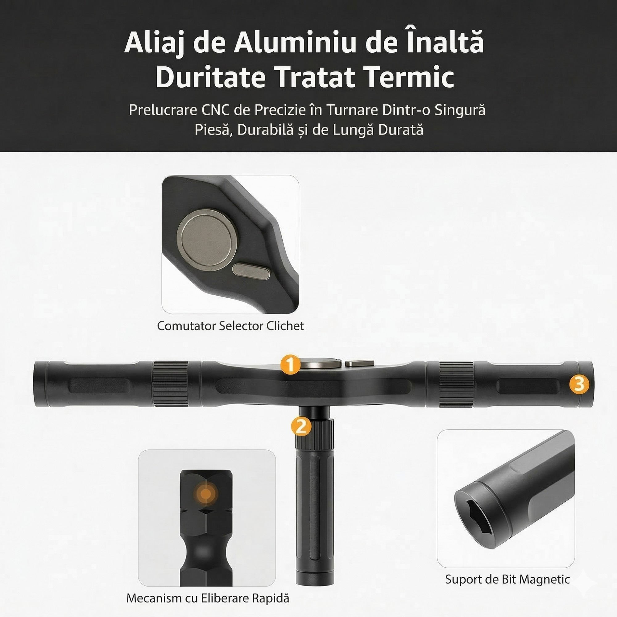 Manerul este echipat cu sistem de clichet care permite rotirea continua in sens dorit fara repozitionarea permanenta a surubelnitei. Acest mecanism: