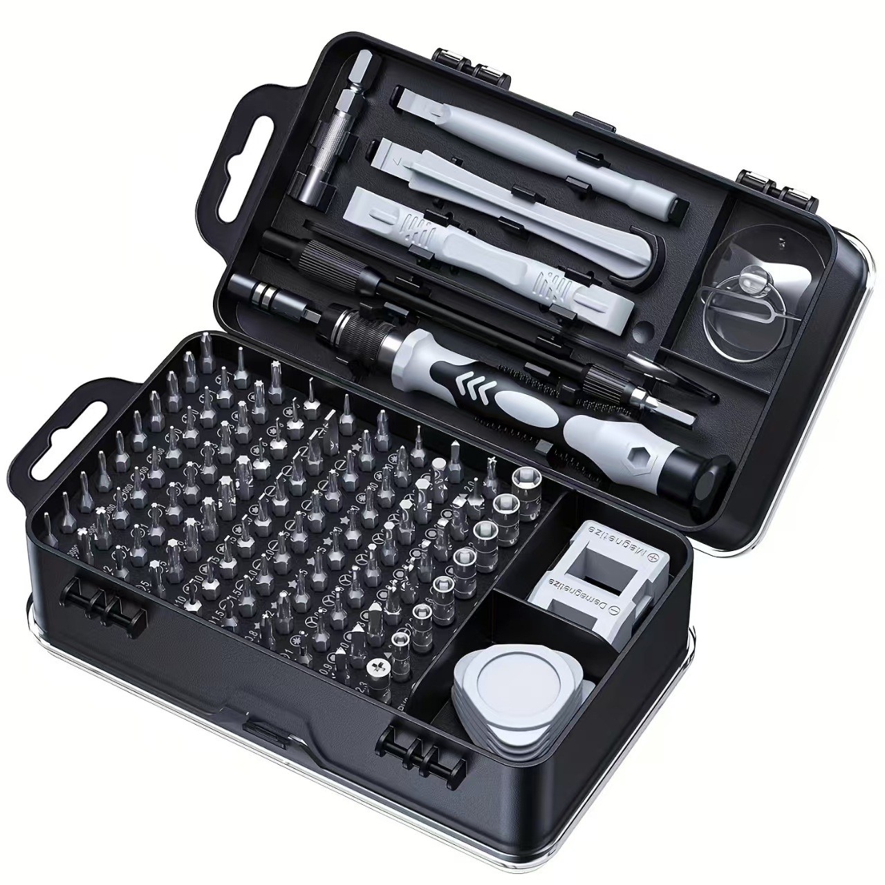 precum si un set de deschideri, datorita carora putetiaccesa cu usurinta interiorul unui smartphone, tablete sau laptop. Setul include si o penseta de precizie, un ac specializat pentru scoaterea tavii cartelei SIM si un magnetizator/demagnetizator.
