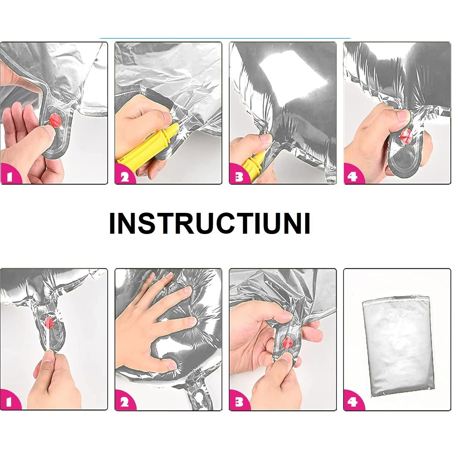 Refolosire prin eliberare ușoară a aerului: Balonul poate fi refolosit prin eliberarea ușoară a aerului din el. Deschide cu atenție orificiul de umflare și apasă ușor pe balon pentru a permite aerului să se elibereze. Această opțiune îți permite să păstrezi balonul pentru evenimente viitoare.
