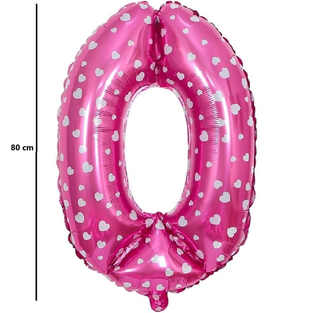 Balon din Folie Metalizata Flippy, Figurina Cifra, Imprimeu Inimi, Tema Aniversare 80 cm, Ambalaj Individual, Pai inclus, Umflare cu Aer sau Heliu, Roz, Cifra 0