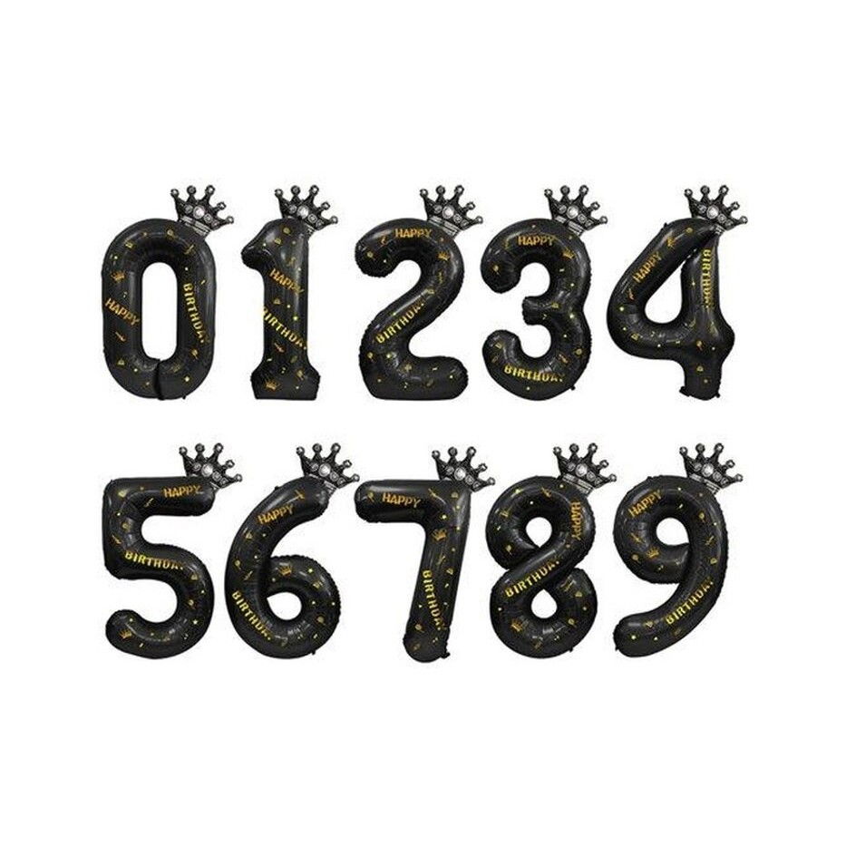 Balon din Folie Metalizata Flippy, Figurina Cifra si Coroana, Scris Happy Birthday, Tema Aniversare 100 cm, Ambalaj Individual, Pai inclus, Umflare cu Aer sau Heliu, Negru, Cifra 7