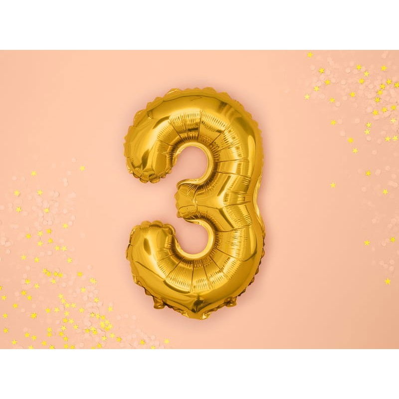 Balon din Folie Metalizata Flippy, Figurina Cifra, Tema Aniversare 100 cm, Ambalaj Individual, Pai inclus, Umflare cu Aer sau Heliu, Auriu, Cifra 3