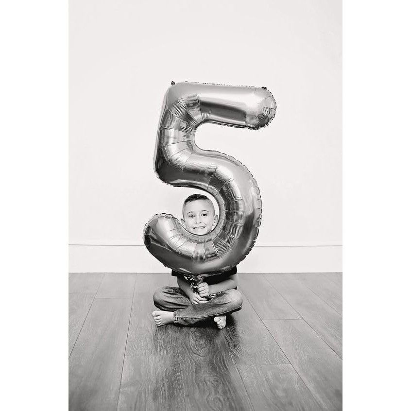 Balon din Folie Metalizata, Flippy, Figurina Cifra, Tema Aniversare 80 cm, Ambalaj Individual, Pai inclus, Umflare cu Aer sau Heliu, Argintiu, Cifra 5
