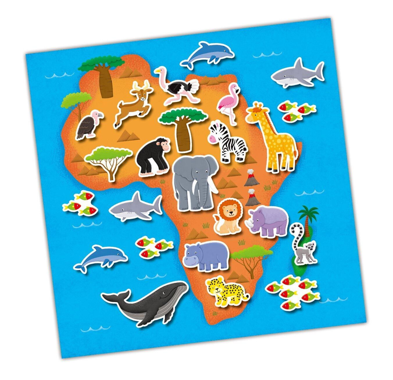 copiii pot invata animalele specifice fiecarei zone geografice lipind stickerele pe continentul corespunzator