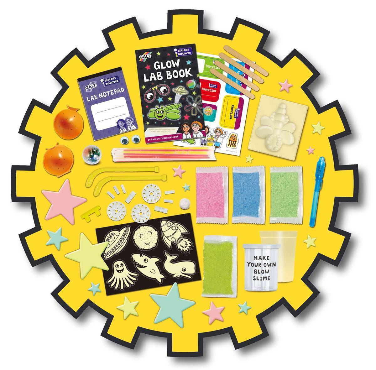 Un set de experimente minunat pentru micutii curiosi! Vei putea sa faci experimente cu betisoare fluorescente, sa iti faci singur o mingiuta fluorescenta si sa modelezi o insecta gelatinoasa care straluceste in intuneric.