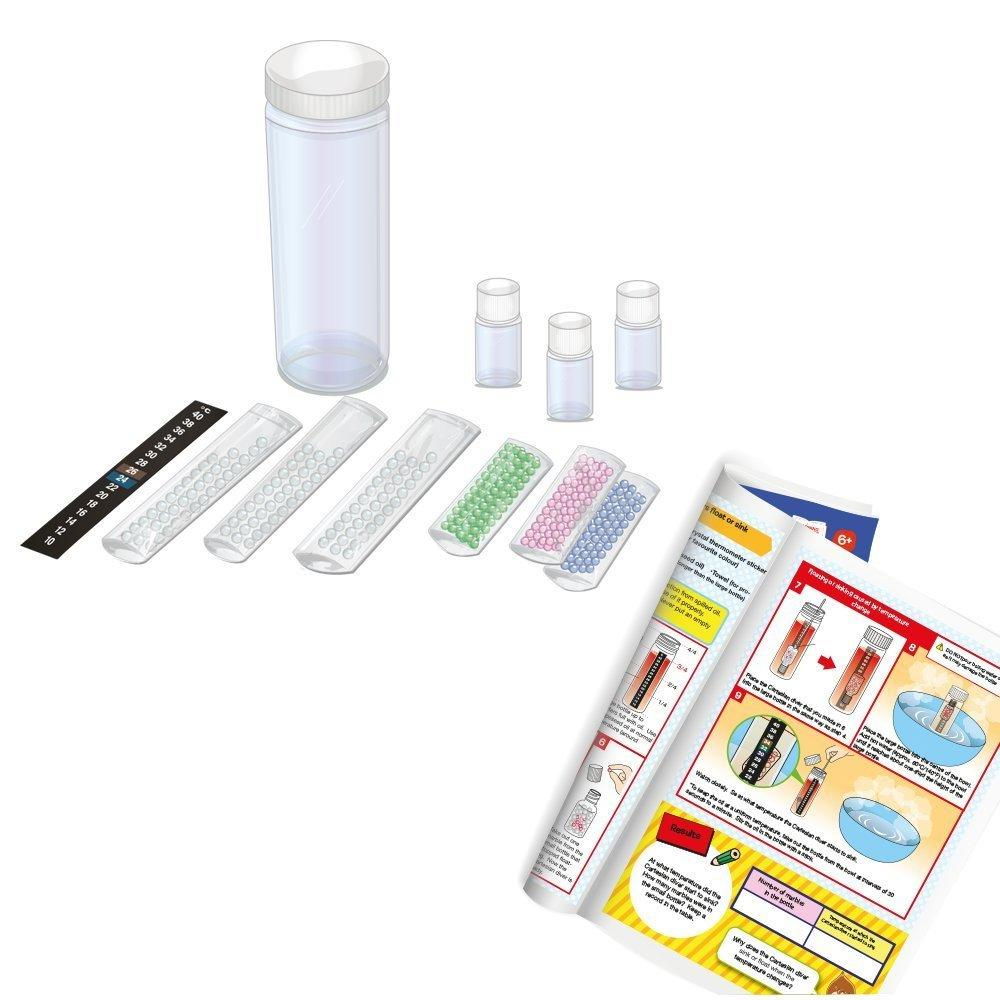 Un set perfect pentru micutii oameni de stiinta!Cu ajutorul acestui set veti afla o multime de informatii interesante si veti pune in practica experimente amuzante. Termometrul lui Galileo Galilei este un termometru facut din sticla sigilata care contine un lichid transparent. In acest lichid plutesc mai multe bile care contin la randul lor lichide de culori diferite, cu densitati diferite. Invata cum sa iti faci singur termometrul lui Galileo Galilei si descopera cum functioneza acesta punand in practica experimente cu presiune, volum sau densitate.