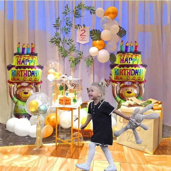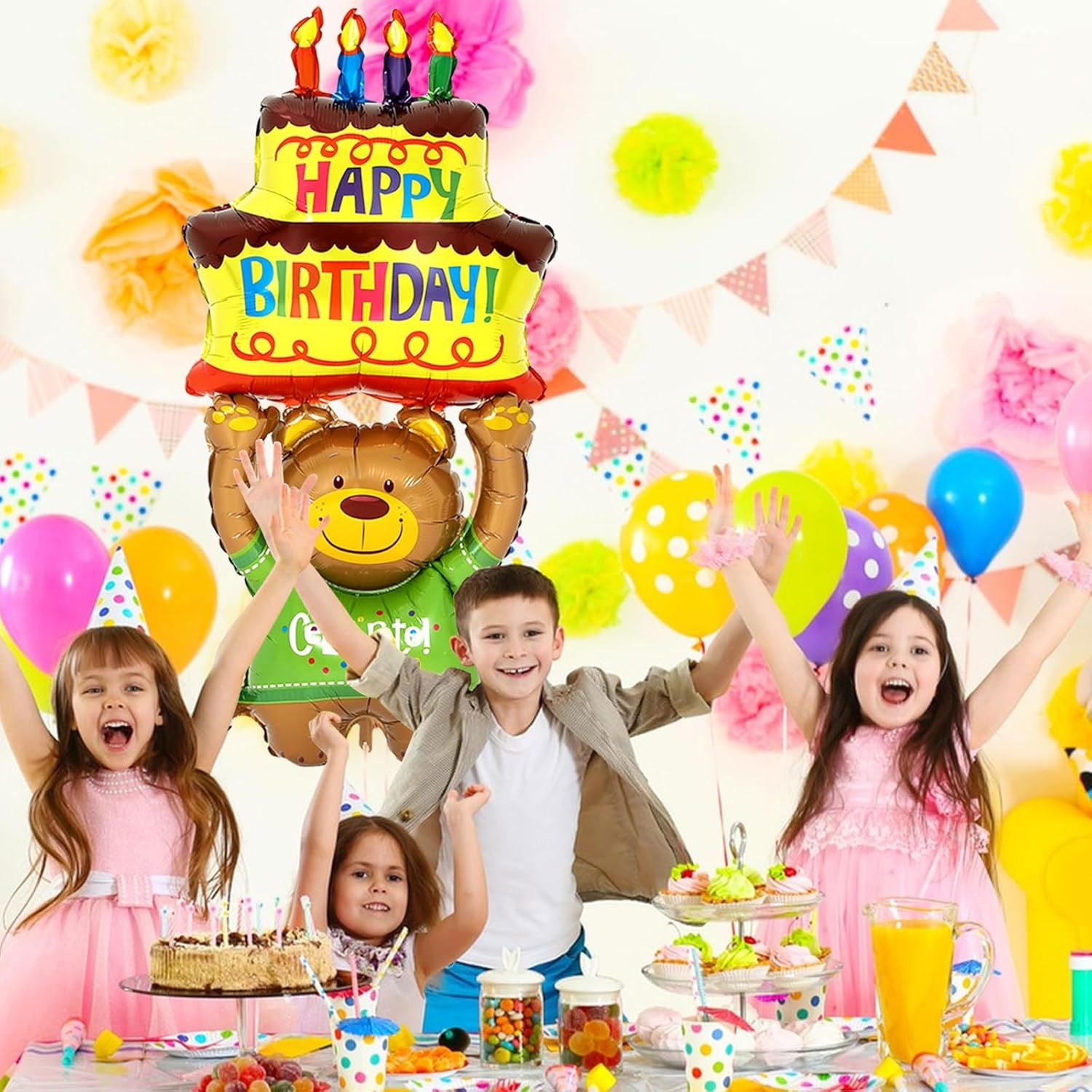 Balon din Folie Metalizata, Flippy, Figurine Animalute, Model Ursulet cu Tort Aniversar, 124x65 cm, Ambalaj Individual, Pai Inclus, Umflare cu Aer sau Heliu, Multicolor