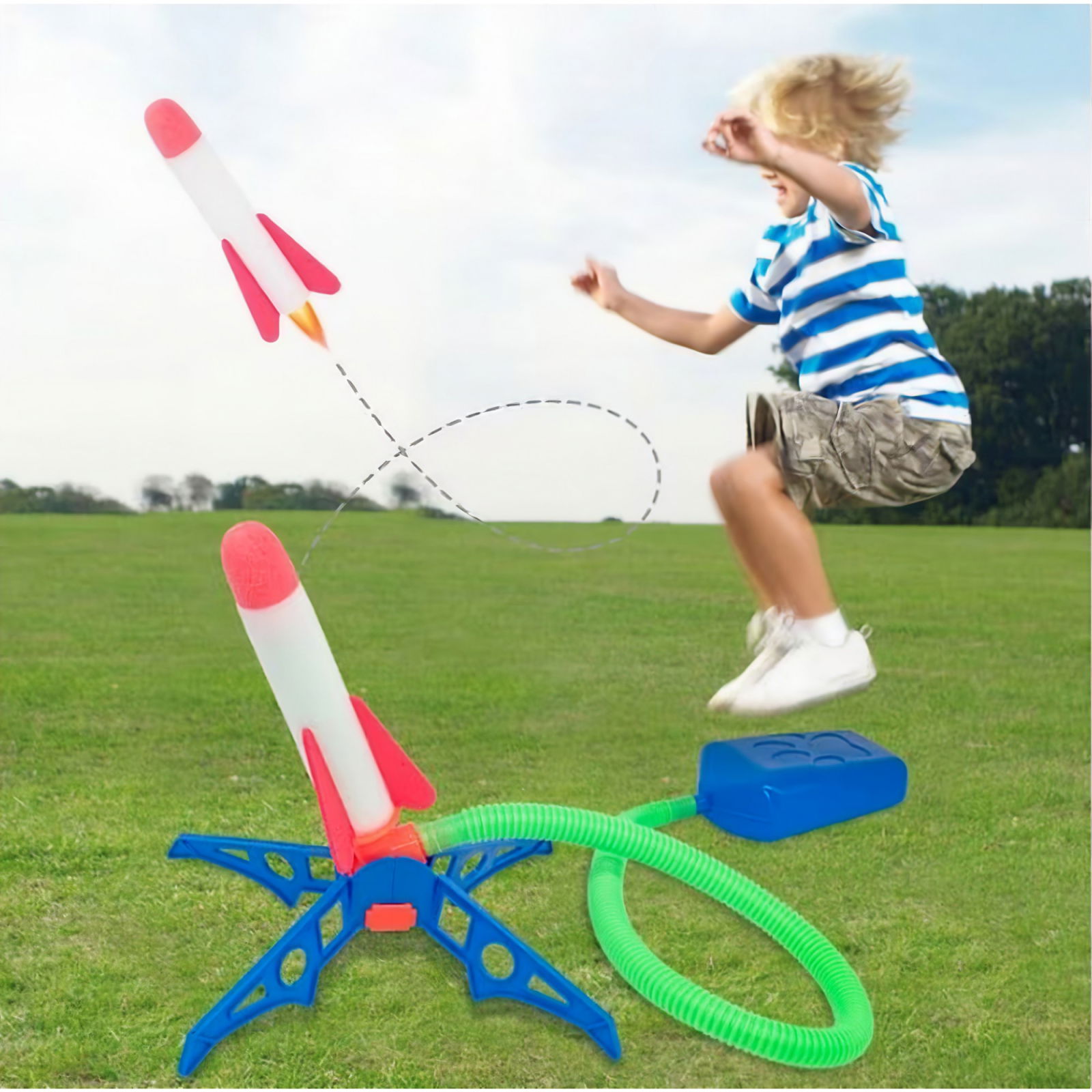LANSATORUL DE RACHETE este un joc de exterior, conceput pentru a oferi copiilor o experienta distractiva si activa in aer liber. Jocul vine cu doua pedale pentru lansarea rachetelor.