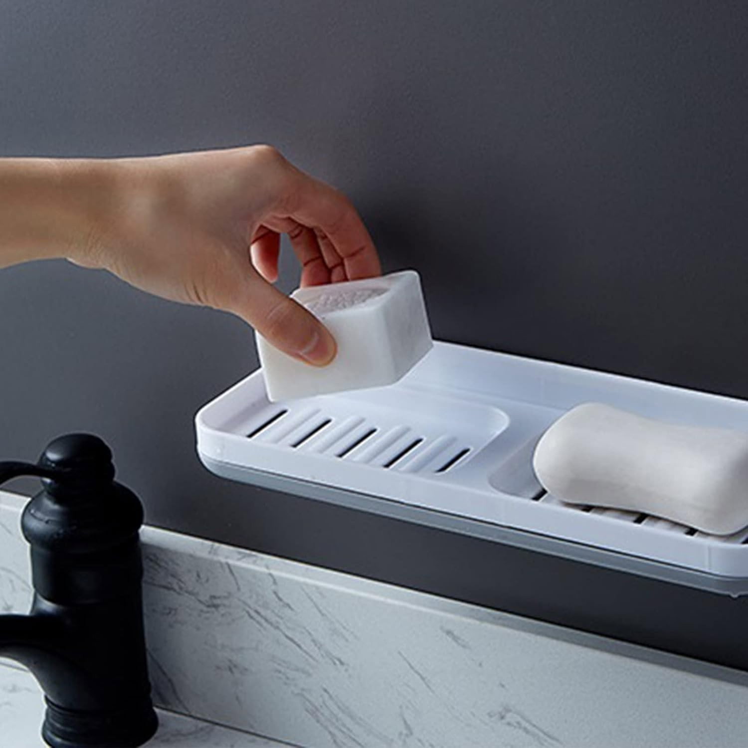 Grila dublă permite drenarea rapidă a apei, prevenind acumularea umezelii și prelungind durata de utilizare a săpunului.