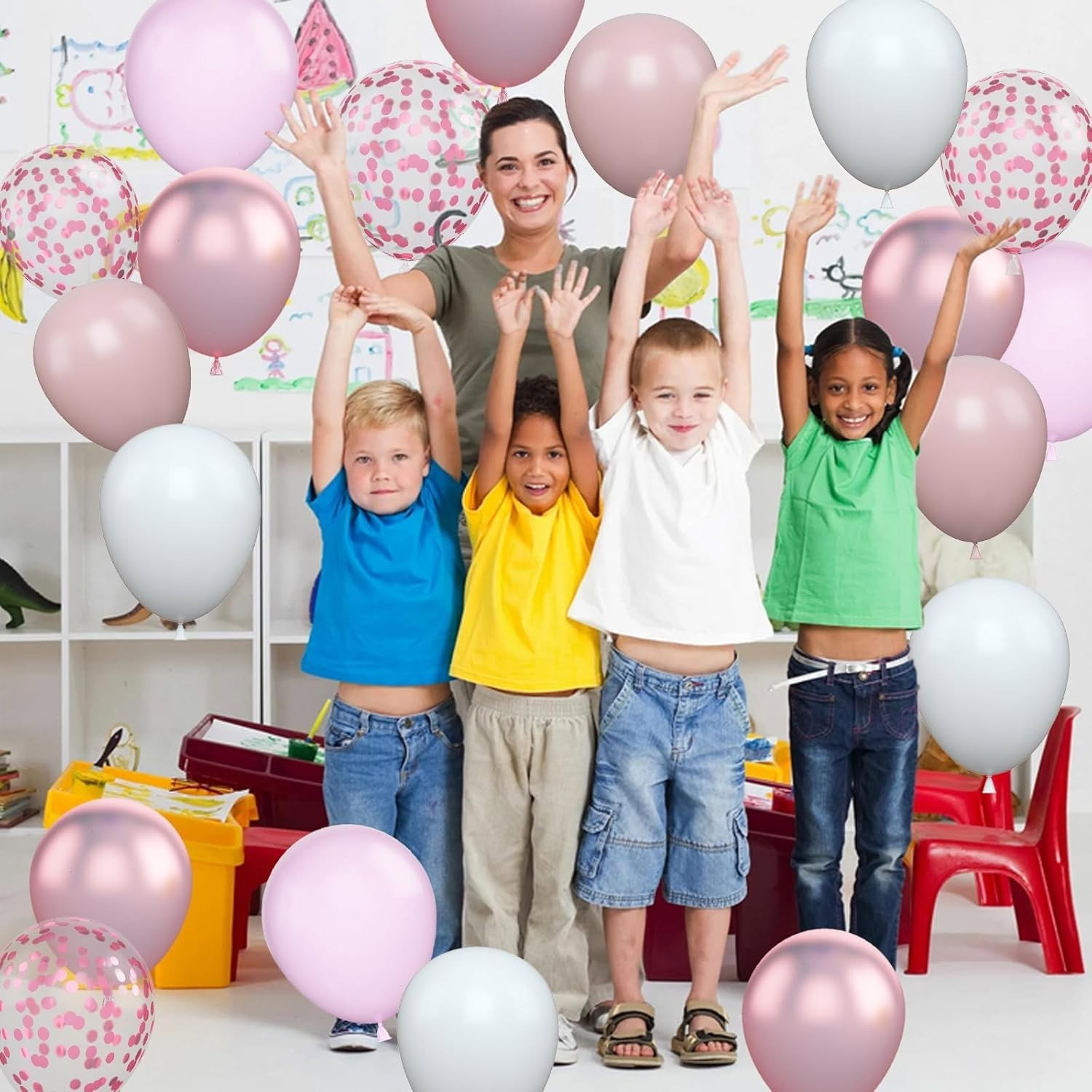 Set 16 Baloane din Latex Metalizate, Flippy, Model Party, 30 cm, Alb, Roz, Roz Chrome, Transparent Confetti 2.8 g