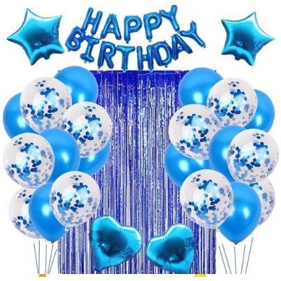 Set 24 de baloane folie si latex, Flippy, 10 baloane latex simple, 10 bloane latex cu paiete, 4 baloane folie, ribon, 1x2 m perdea, Albastru