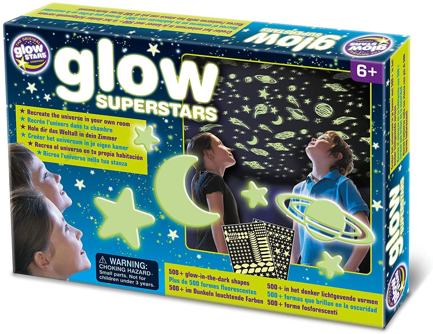setul include 150 de forme fosforescente (planete, stele, meteoriti) care lumineaza in intuneric si 350 de abtibilduri cu stele