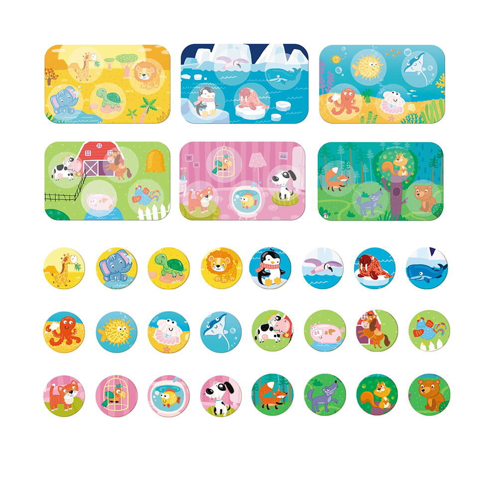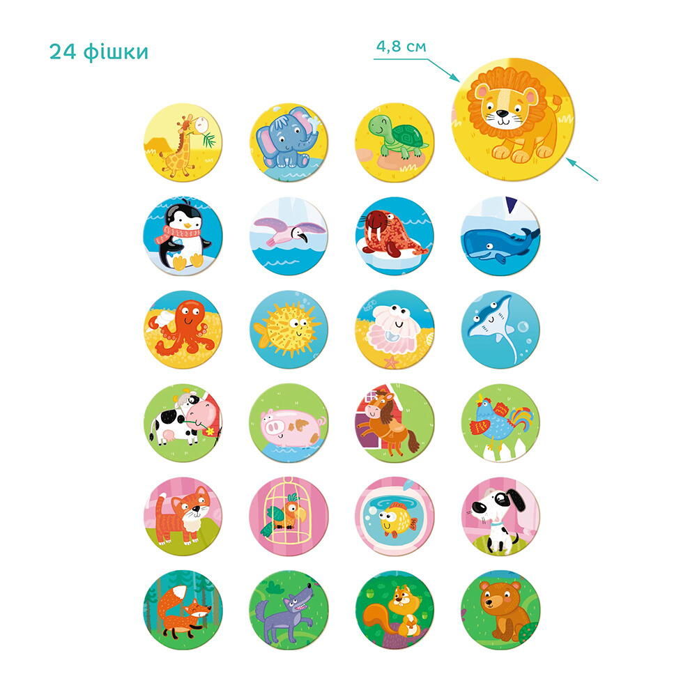 setul include: 6 carduri cu imagini diferite, 24 jetoane si instructiuni