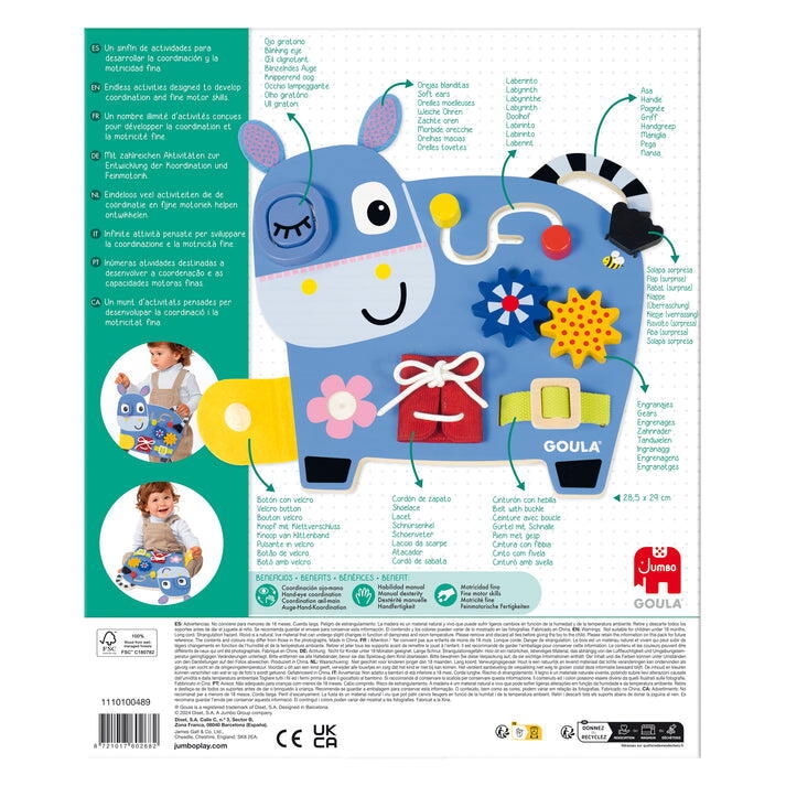 8 activitati interactive – labirint, clapeta cu scai (Velcro), rotite, ochi mobil, urechi din fetru, catarama, siret, codita cu elastic