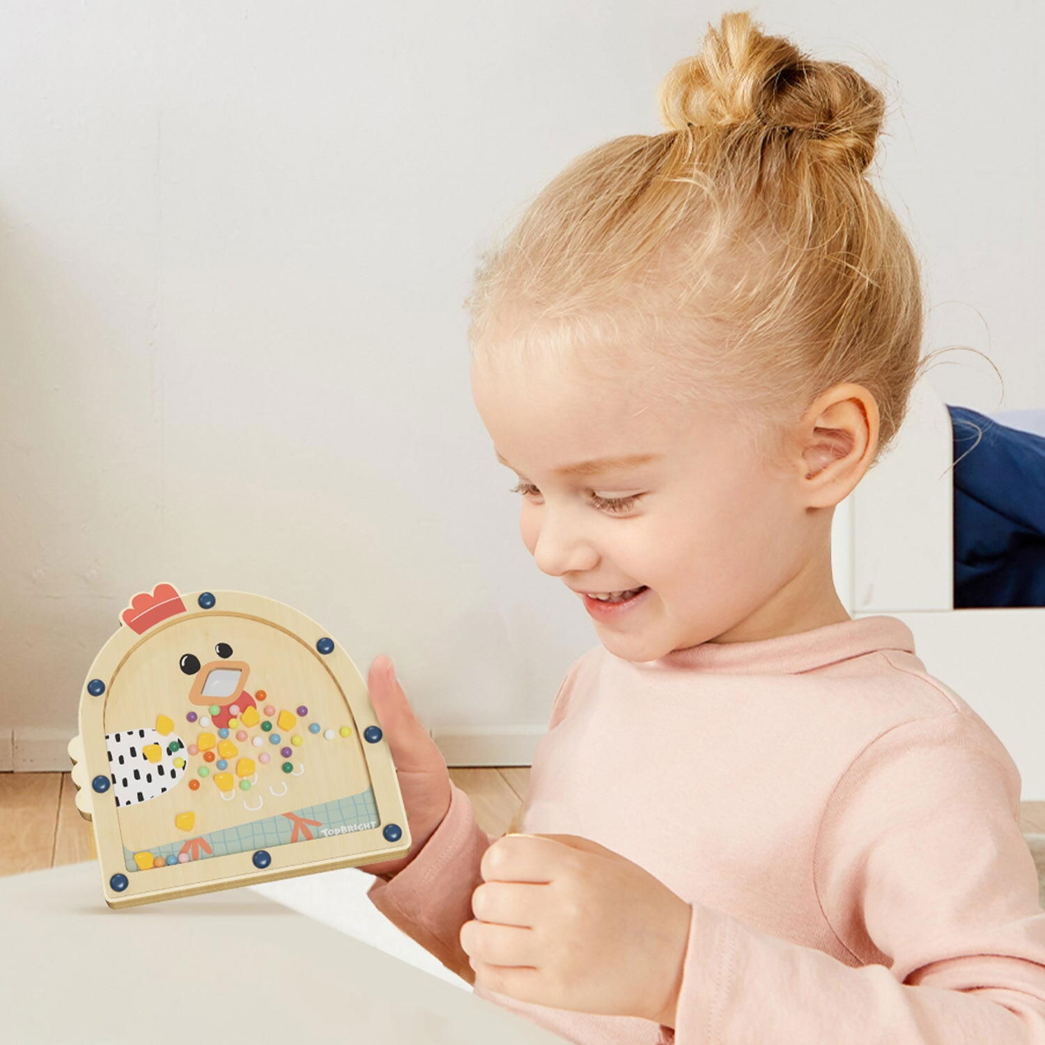copiii pot hrani gaina cu boabe de porumb, agitand aripile acesteia si observand cum boabele cad in ciocul gainii, stimuland jocul imaginar si creativ