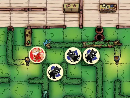 In Cursa pisicilor Ninja, jucatorii se impart in doua tabere: pisicile Ninja – care incearca sa se strecoare nevazute si sa ajunga la acvariul cu pesti si cainii Samurai – care patruleaza tabla si trebuie sa descopere si captureze ninja inainte ca acestia sa reuseasca sa ajunga la acvariul cu pesti koi
