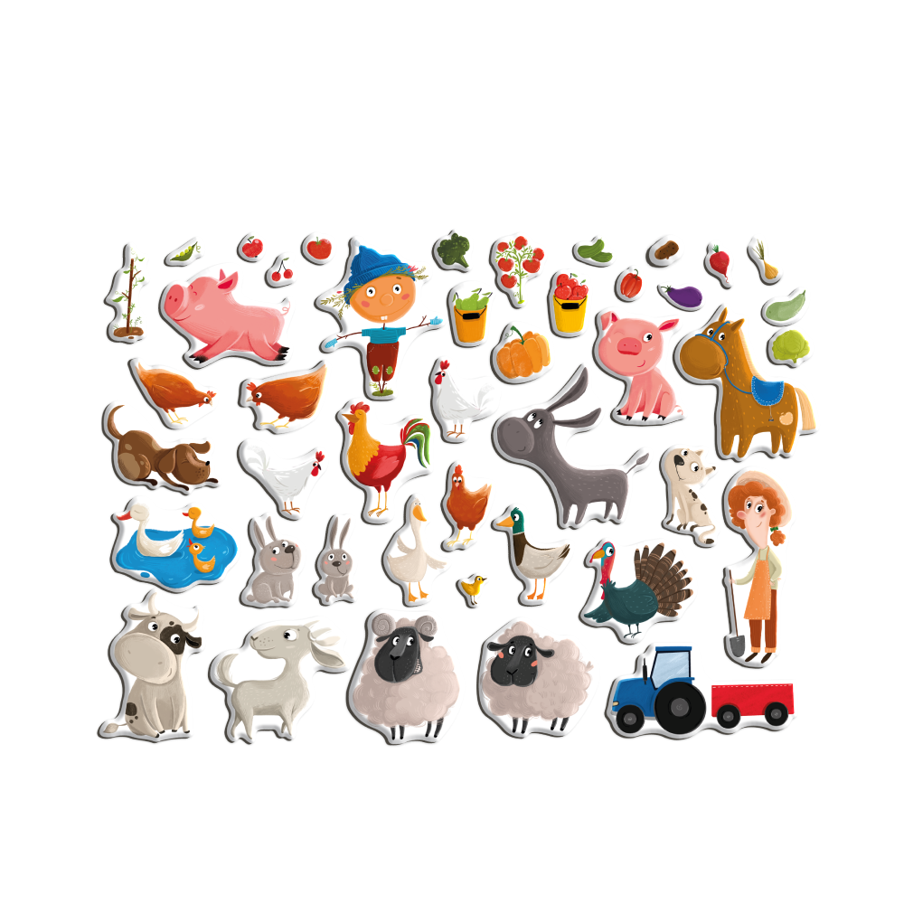 44 magneti cu elemente de la ferma (fermier, animalute, tractor, sperietoare de ciori etc.)