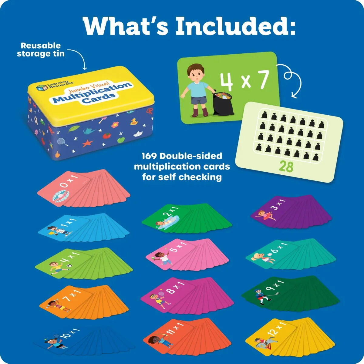 Cele 169 de carduri de inmultire cu doua fete acopera toate combinatiile clasice din tabla inmultirii (de la 1x1 pana la 12x12)