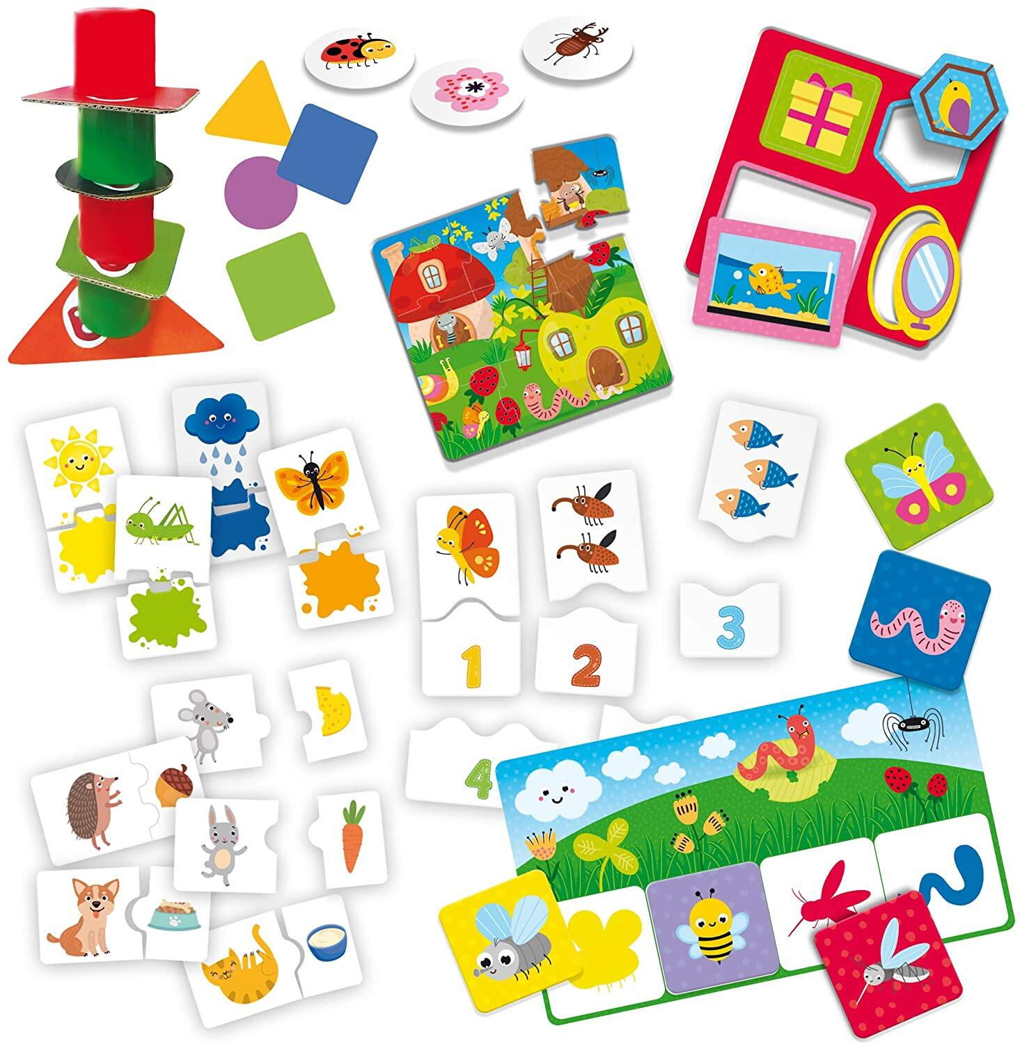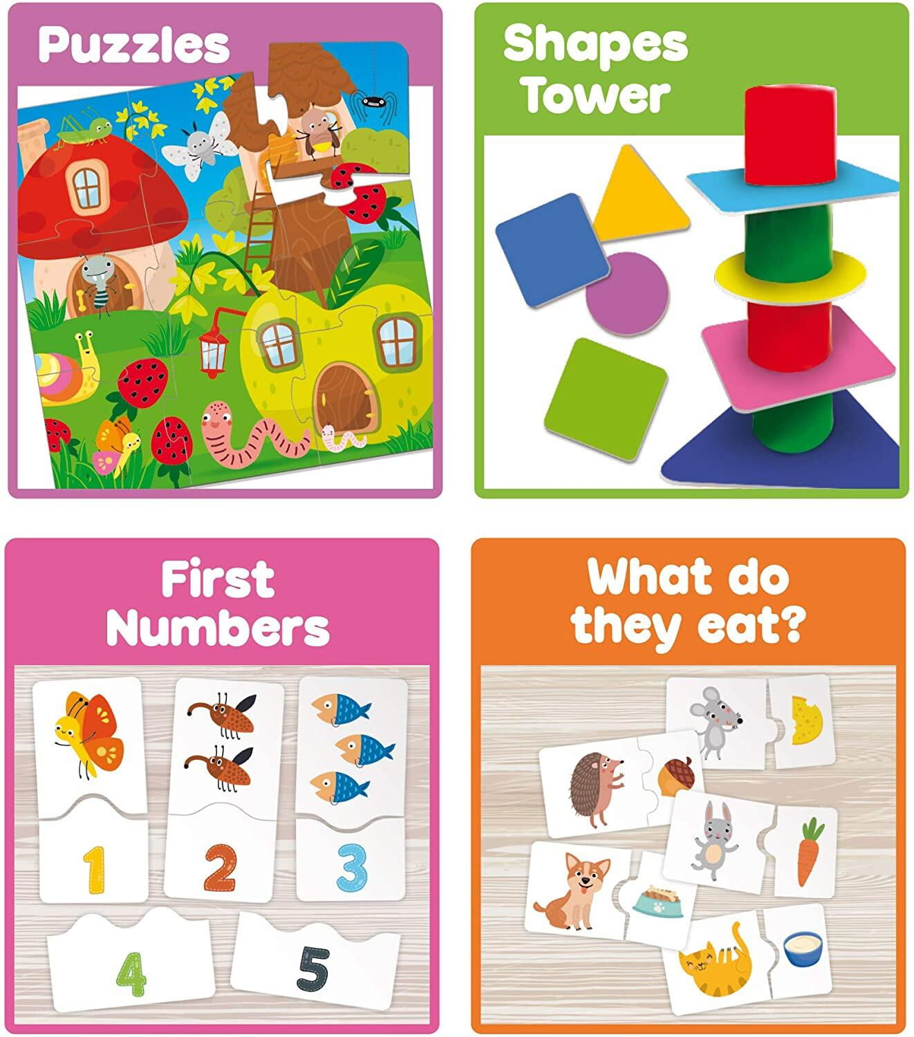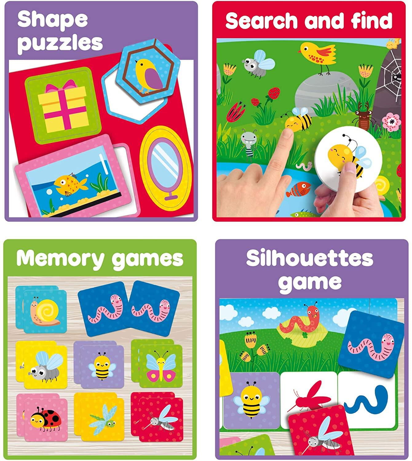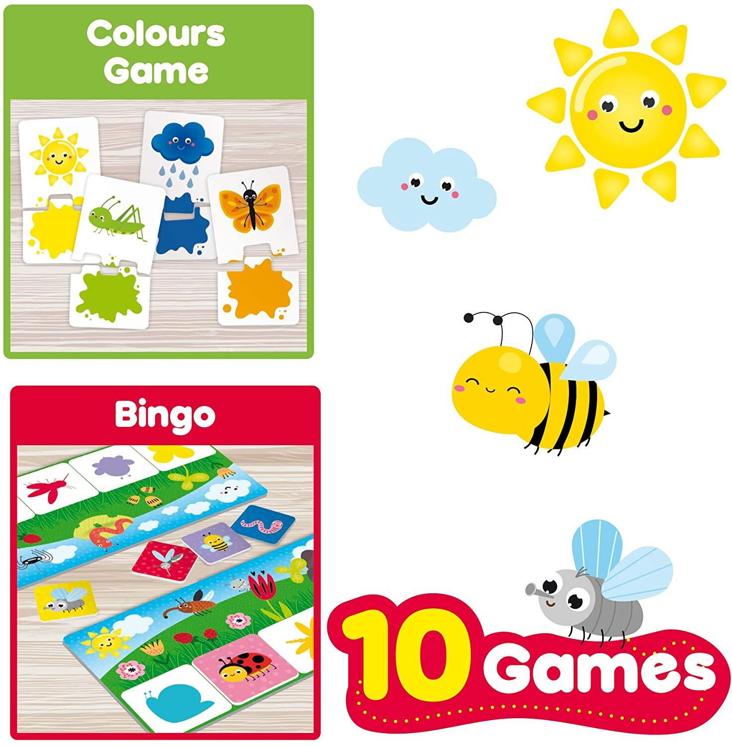 colectia de jocuri 10 in 1 include: puzzle-uri, turnulet cu forme geometrice, puzzle cu forme, joc tip cauta si gaseste, joc cu culori, joc cu numere, joc de asociere animalute-alimente, joc de memorie, joc de memorie cu siluete si joc de Bingo