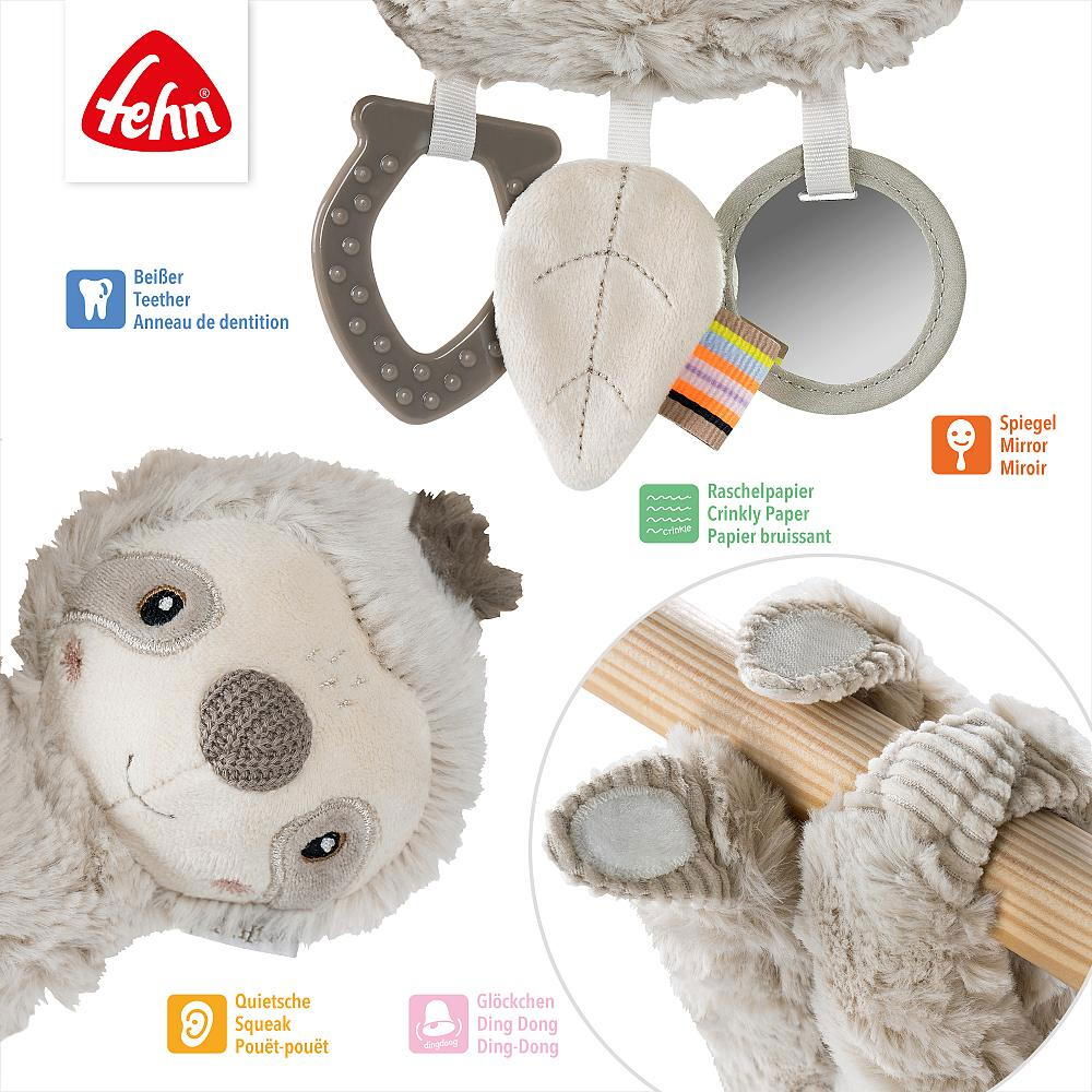 Aceasta jucarie de plus combina materiale moi si texturi variate cu elemente interactive precum zornaitoare, clopotei, hartie fosnitoare, oglinda si inel de dentitie, oferind bebelusului oportunitati nelimitate de joaca si descoperire