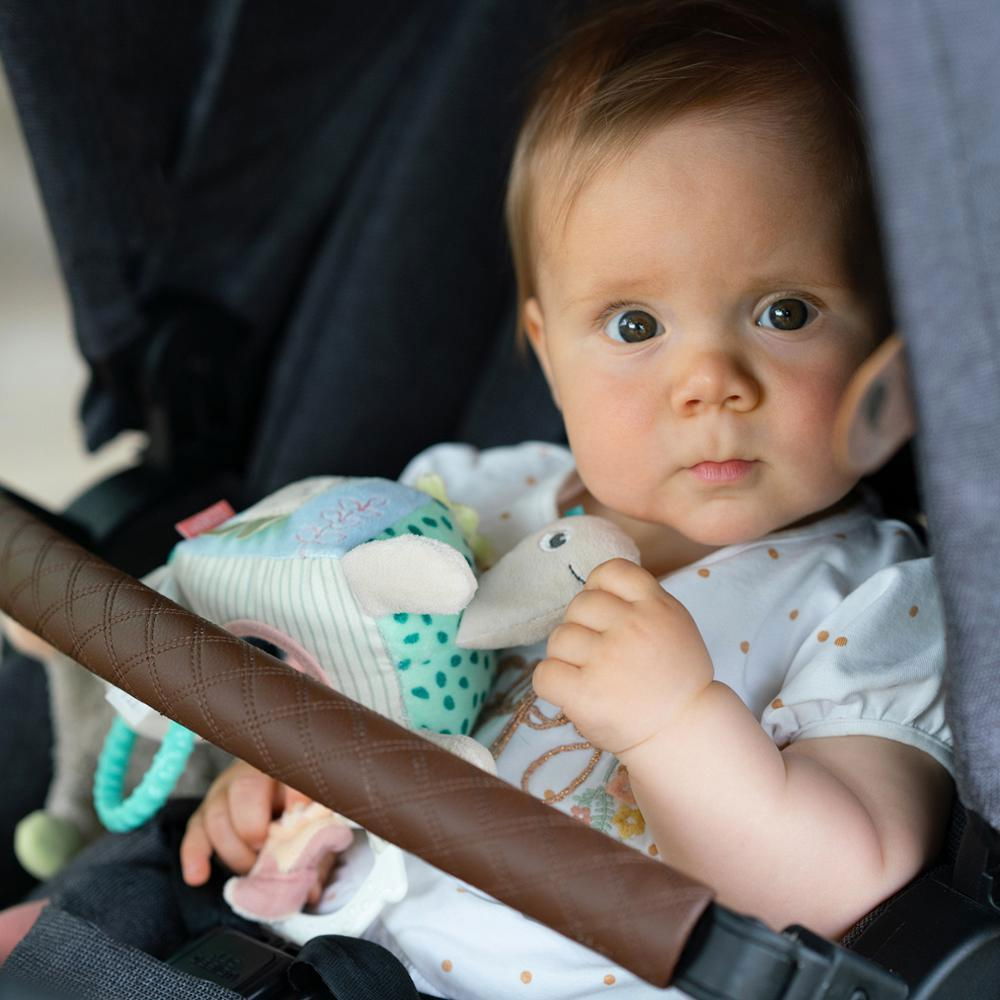 Elemente interactive: jucaria este prevazuta cu oglinda si zornaitoare, jucarie pentru dentitie, pentru a captiva interesul si atentia bebelusului
