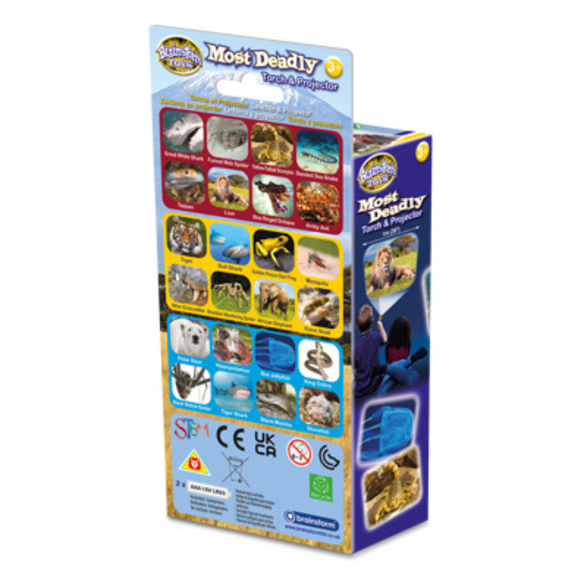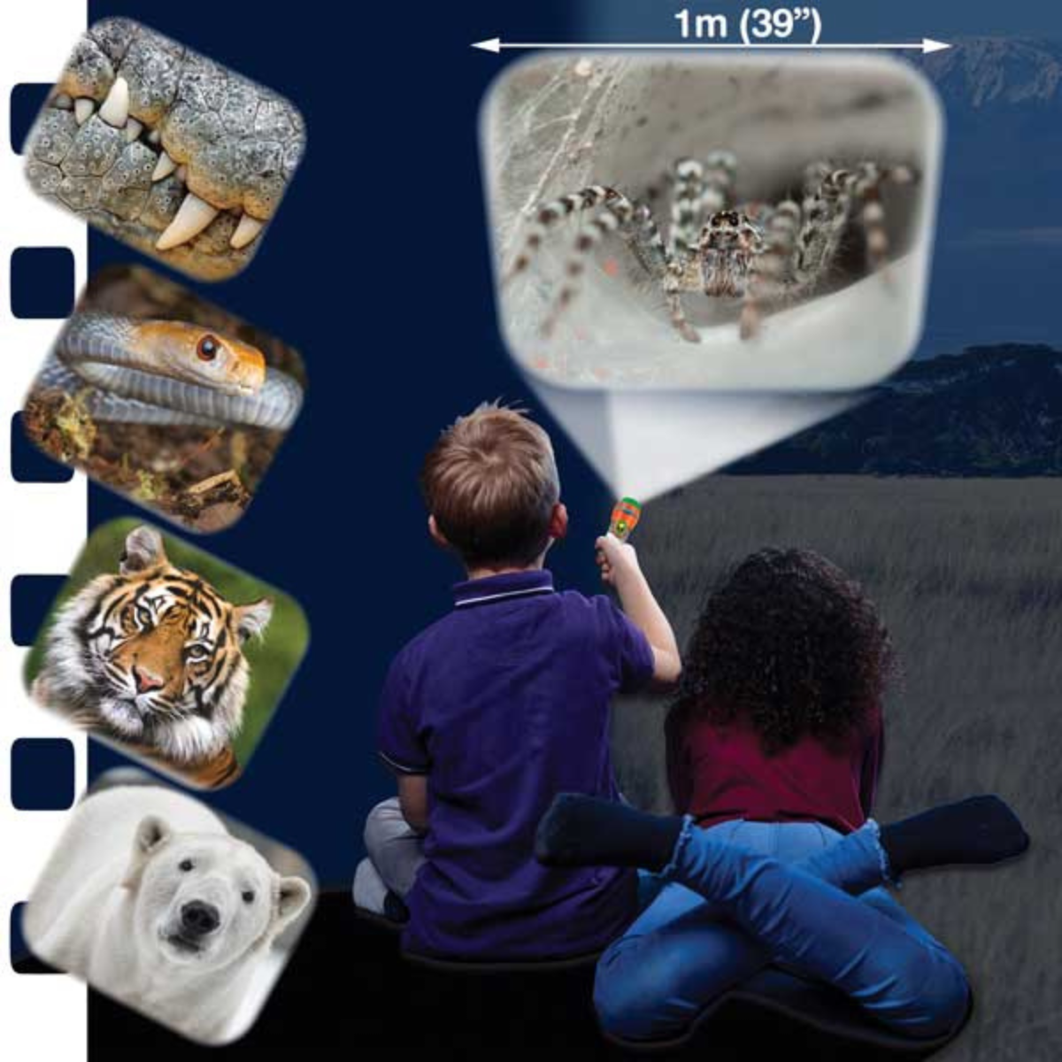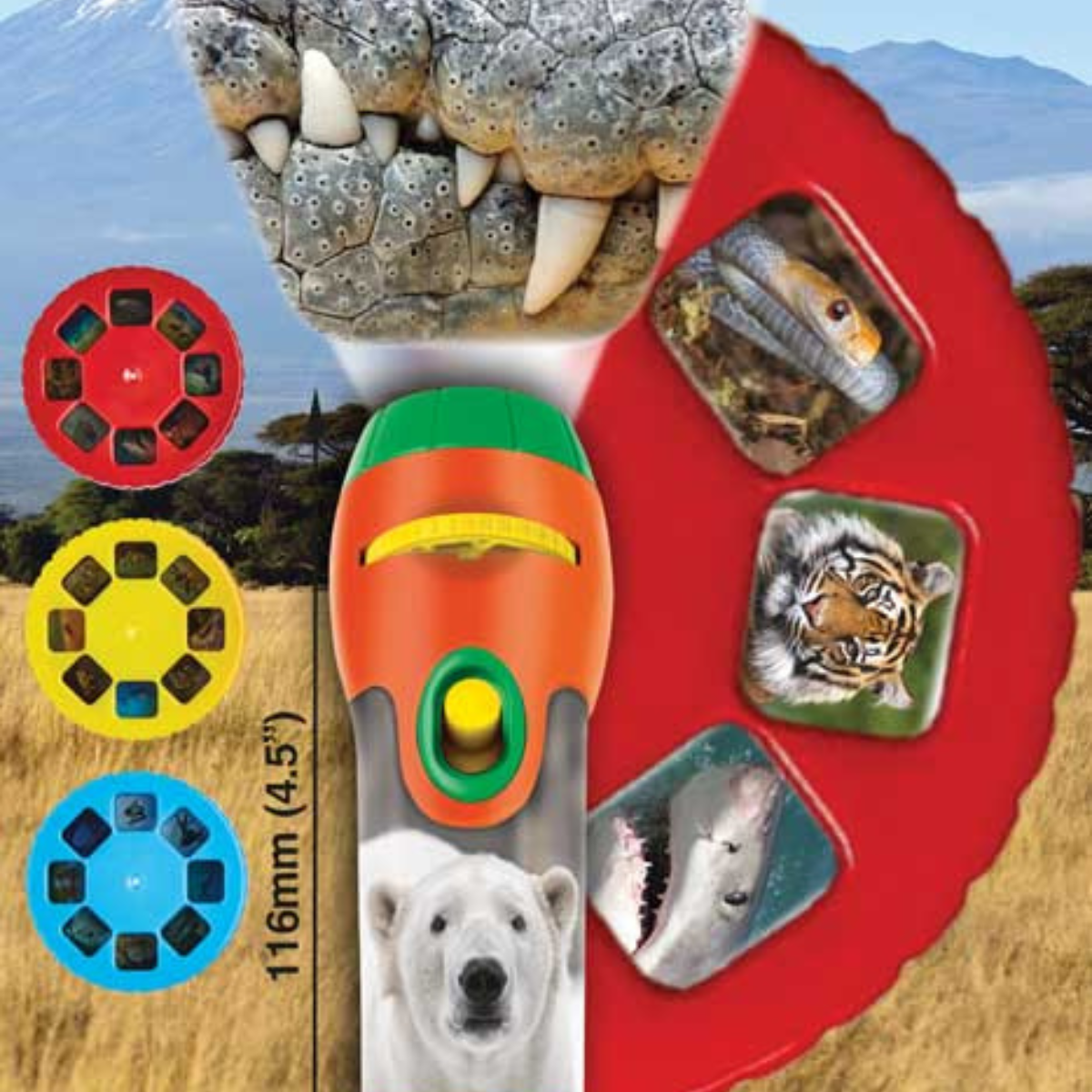 include trei discuri tip diapozitiv cu 24 de imagini spectaculoase ce infatiseaza cele mai periculoase animale din lume – de la pradatori fiorosi si serpi veninosi, pana la insecte letale si creaturi marine impresionante