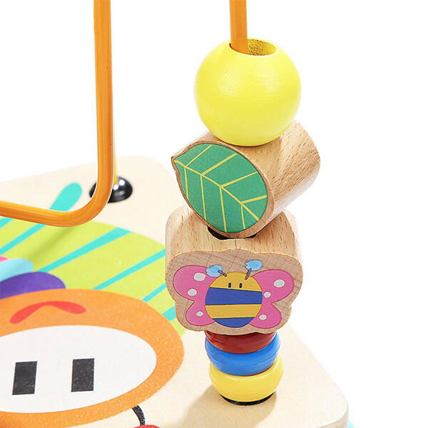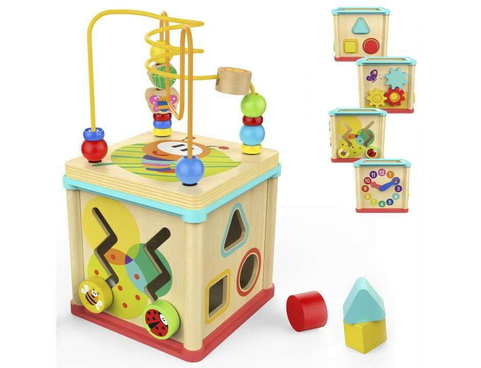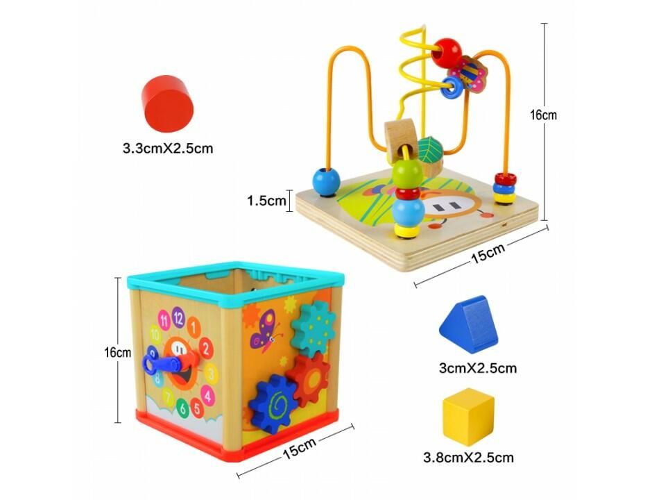 cubul educativ din lemn cu cinci activitati include: sortator cu diferite forme geometrice colorate, un ceas vesel colorat, un labirint cu piese culisante (albinuta si buburuza), un capac cu labirint cu bile colorate si angrenaj cu roti dintate