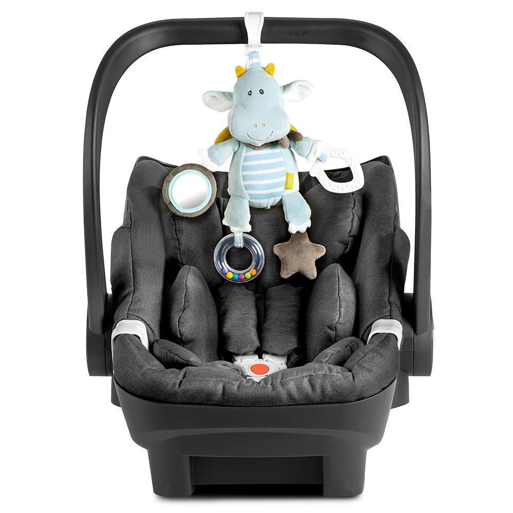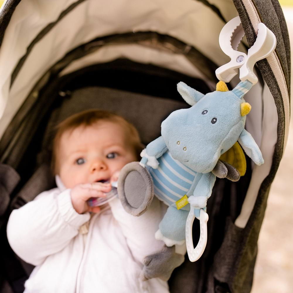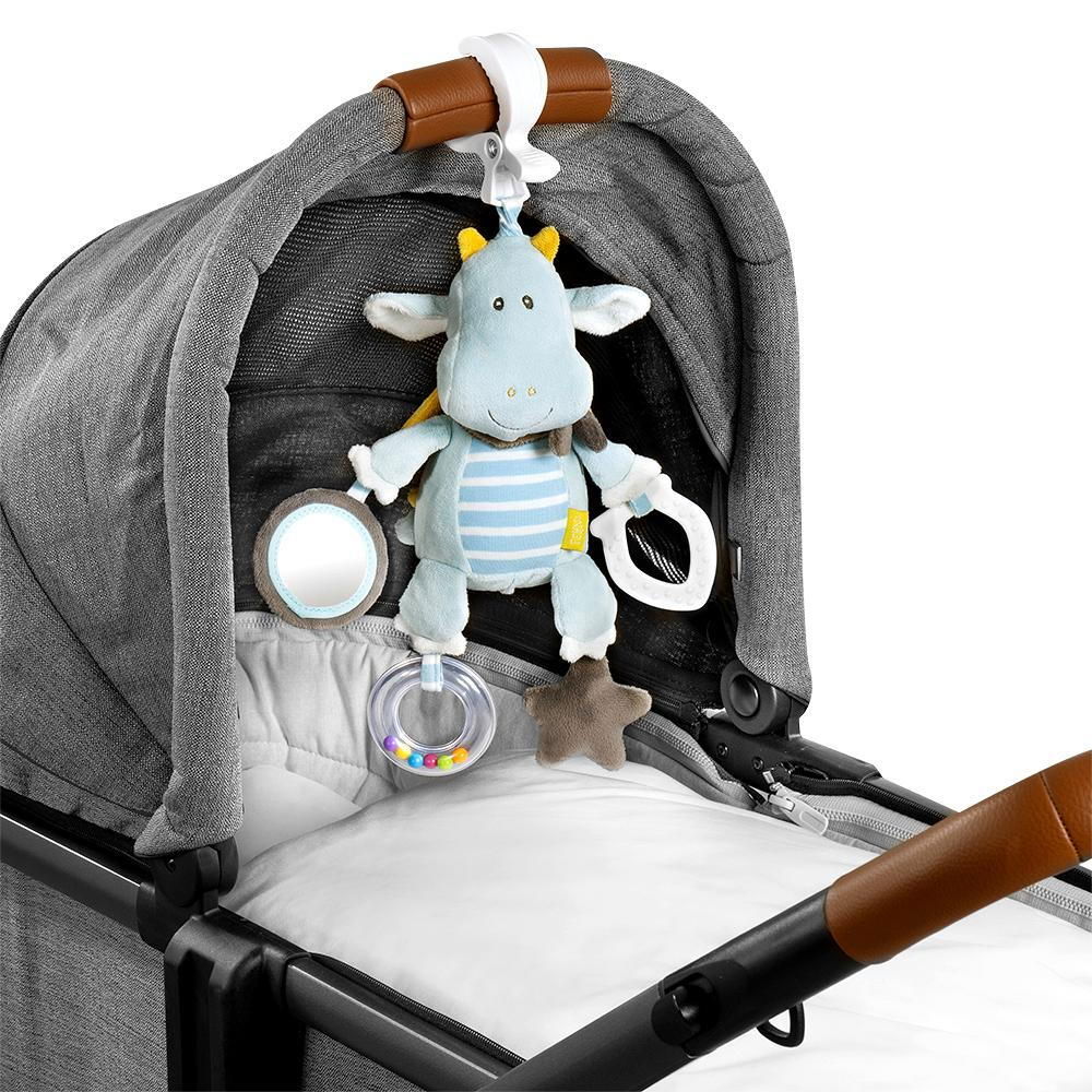Prinderea jucariei: ataseaza cu grija clestele de copertina caruciorului sau marginea patutului, asigura-te ca acesta este fixat in mod sigur si ca jucaria este suspendata in mod corespunzator