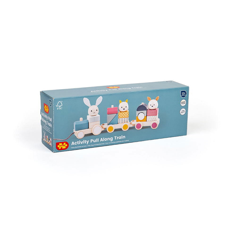 setul include o locomotiva, doua vagoane transportatoare si trei figurine de animale din lemn, care pot fi luate si reasamblate intr-o varietate de moduri, ajutand la dezvoltarea dexteritatii si a abilitatilor de numarare