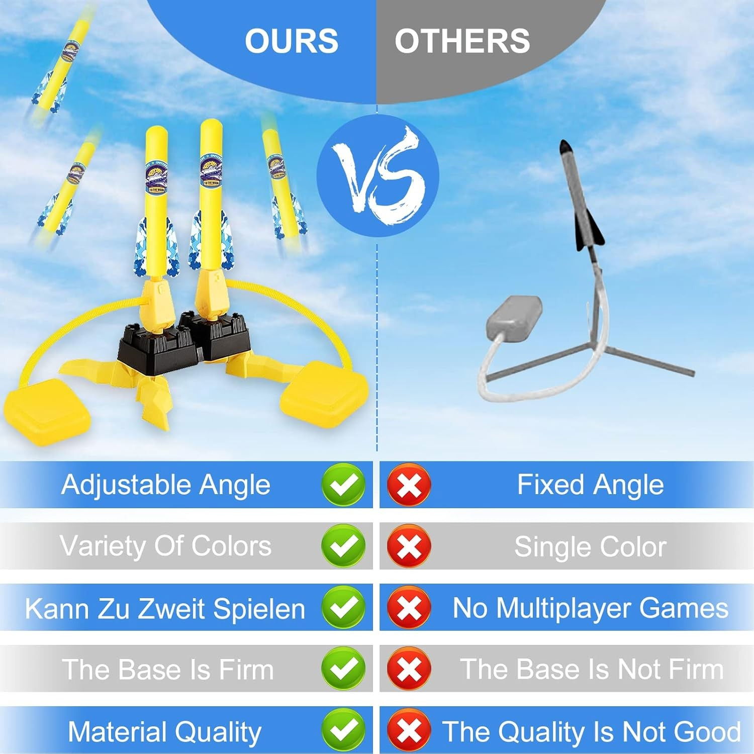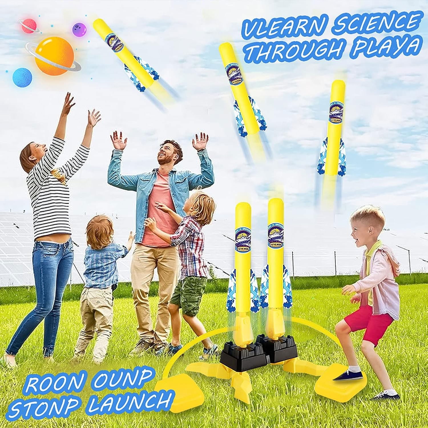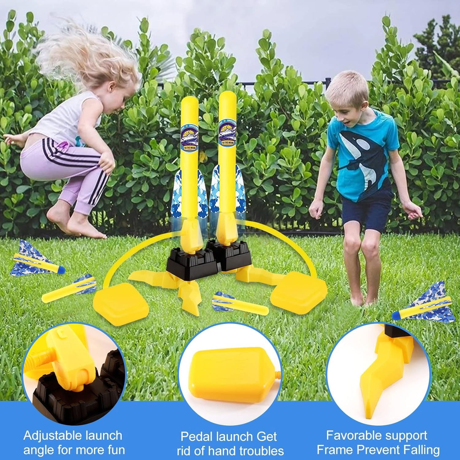 • UNA DINTRE CELE MAI ATRACTIVE JUCARII DE EXTERIOR - Atat fetele cat si baietii vor fi interesati sa se joace in aer liber cu acest lansator, si sa observe cat de sus poate ajunge. Lansator este dublu astfel ca doi copii, sau un copil si un parinte se pot juca in acelasi timp, si pot apasa pedala cat mai tare pentru ca racheta sa fie proiectata cat mai sus.
