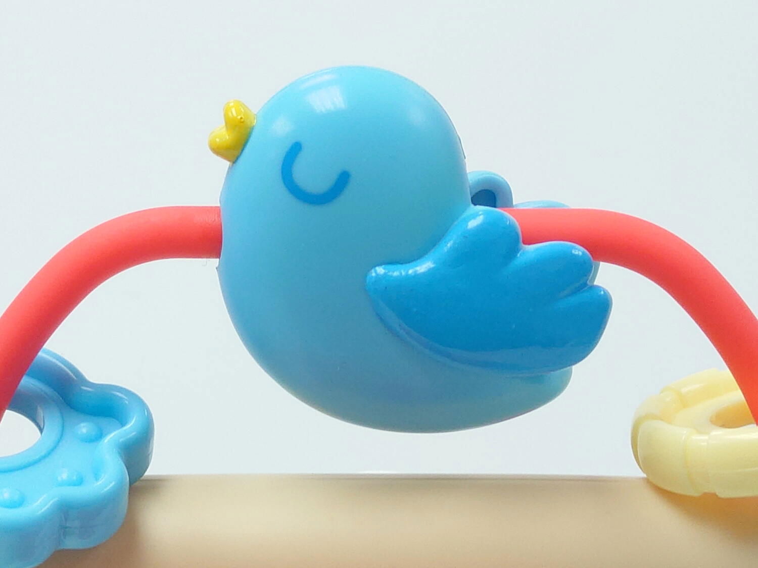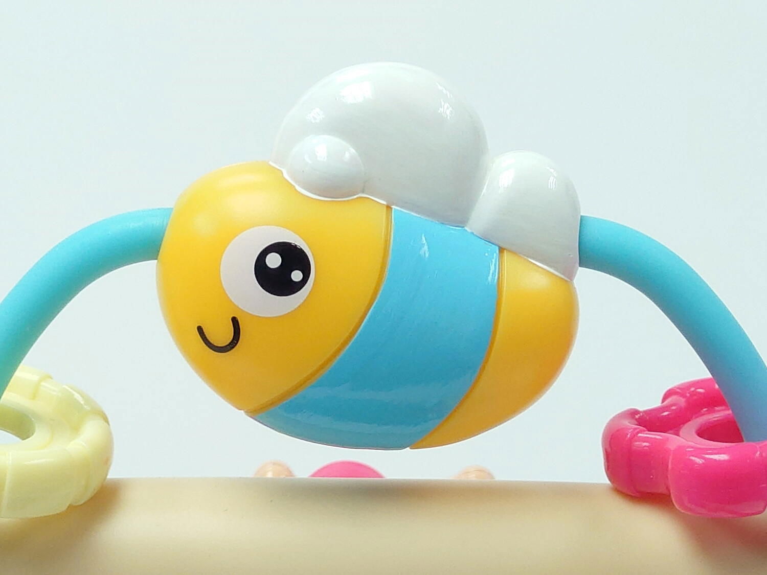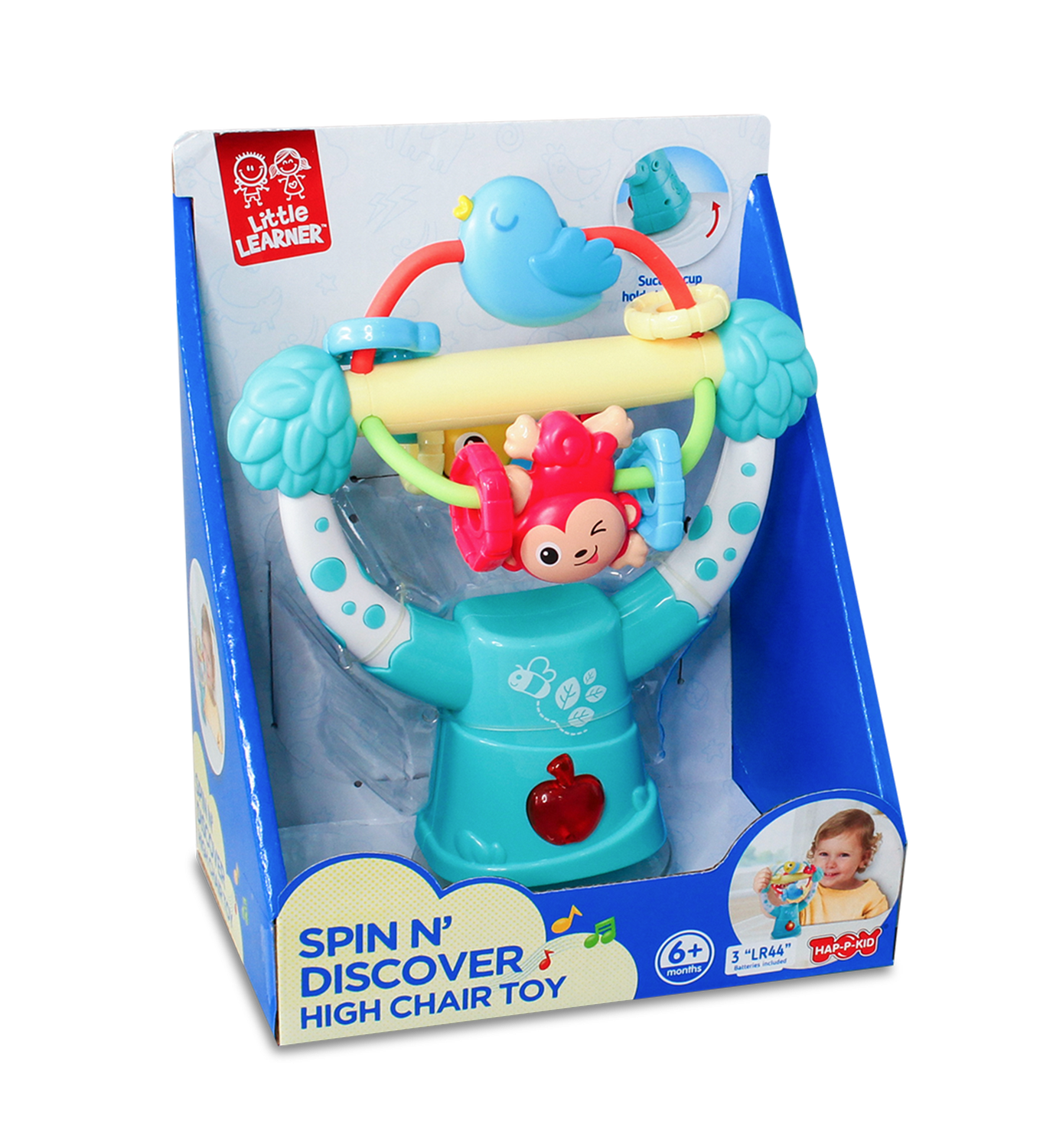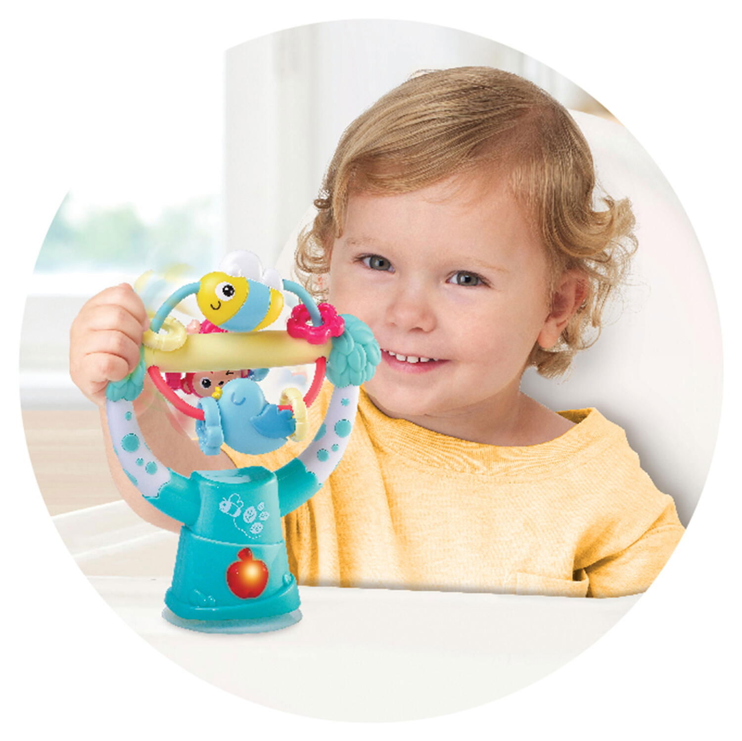 jucaria include un carusel rotativ cu animalute simpatice – maimuta, albina si pasare – care se invart captivand atentia copilului