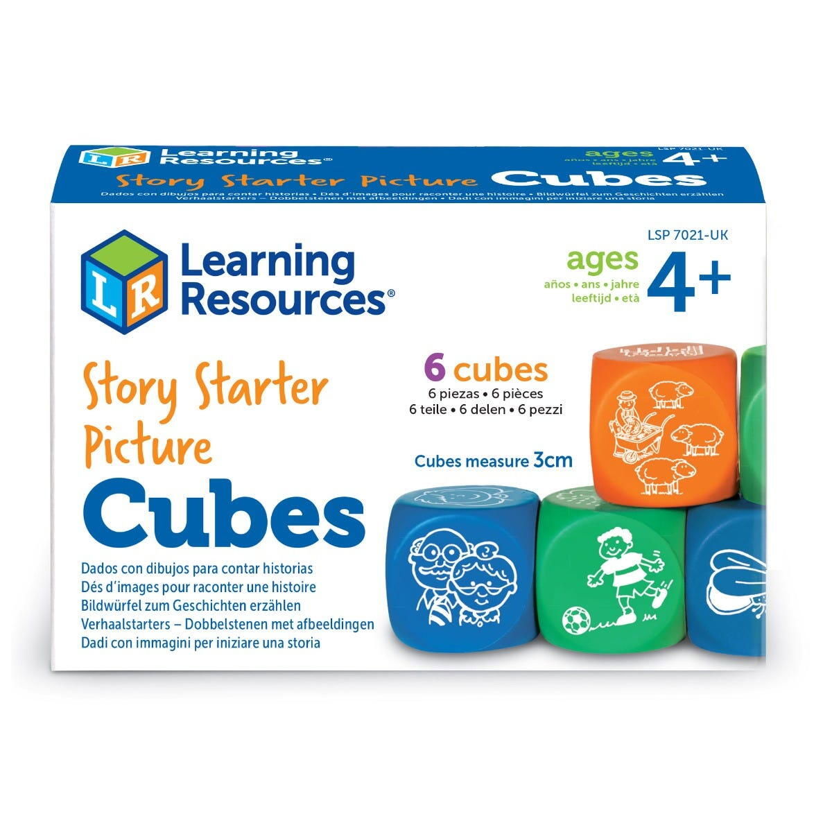 setul include 2 cuburi ce ilustreaza personaje, 2 cuburi cu cadre pentru desfasurarea actiunii, 2 cuburi cu diferite situatii