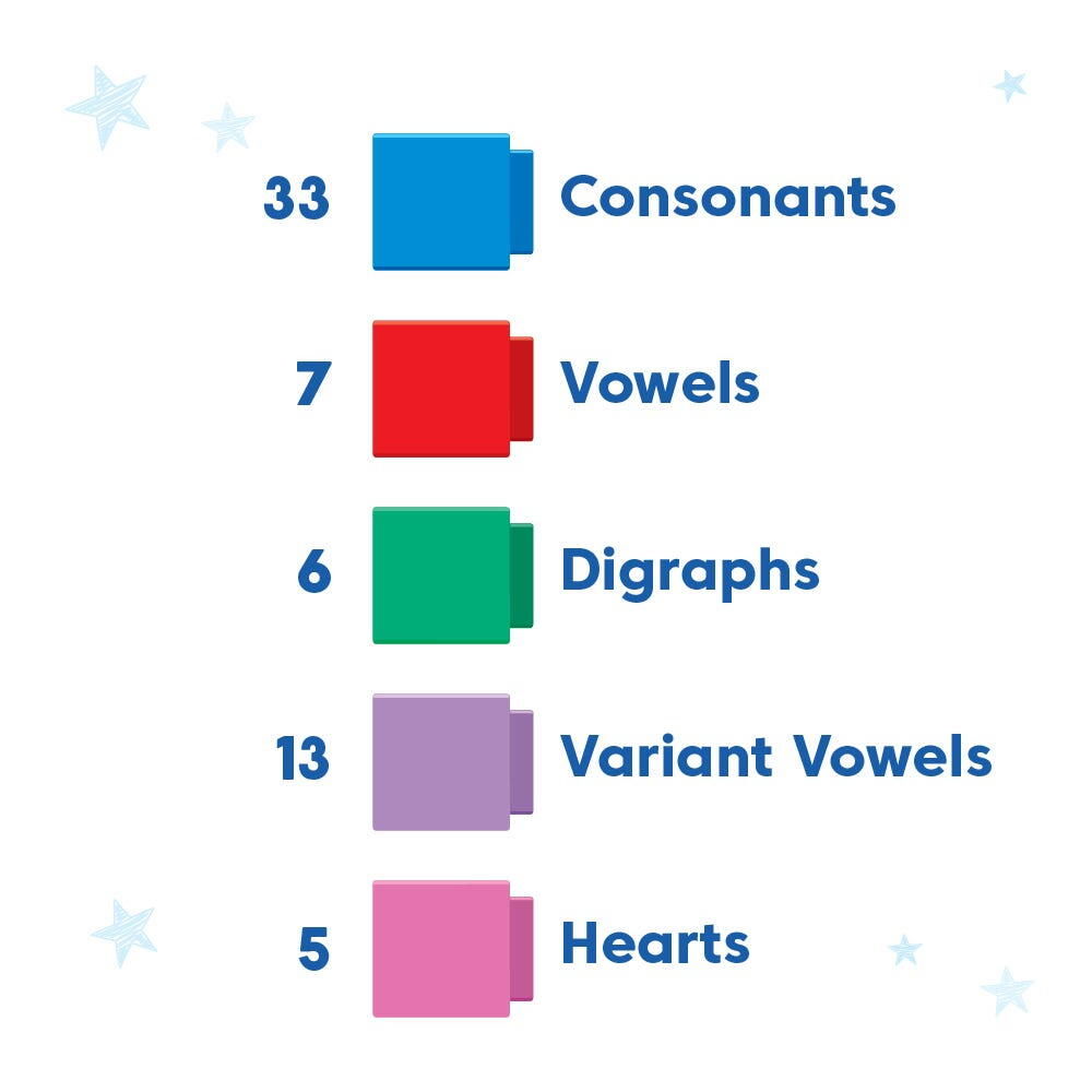 64 cuburi Reading Rods® (33 consoane, 7 vocale, 6 digrafe, 13 grupuri de vocale, 5 inimioare)