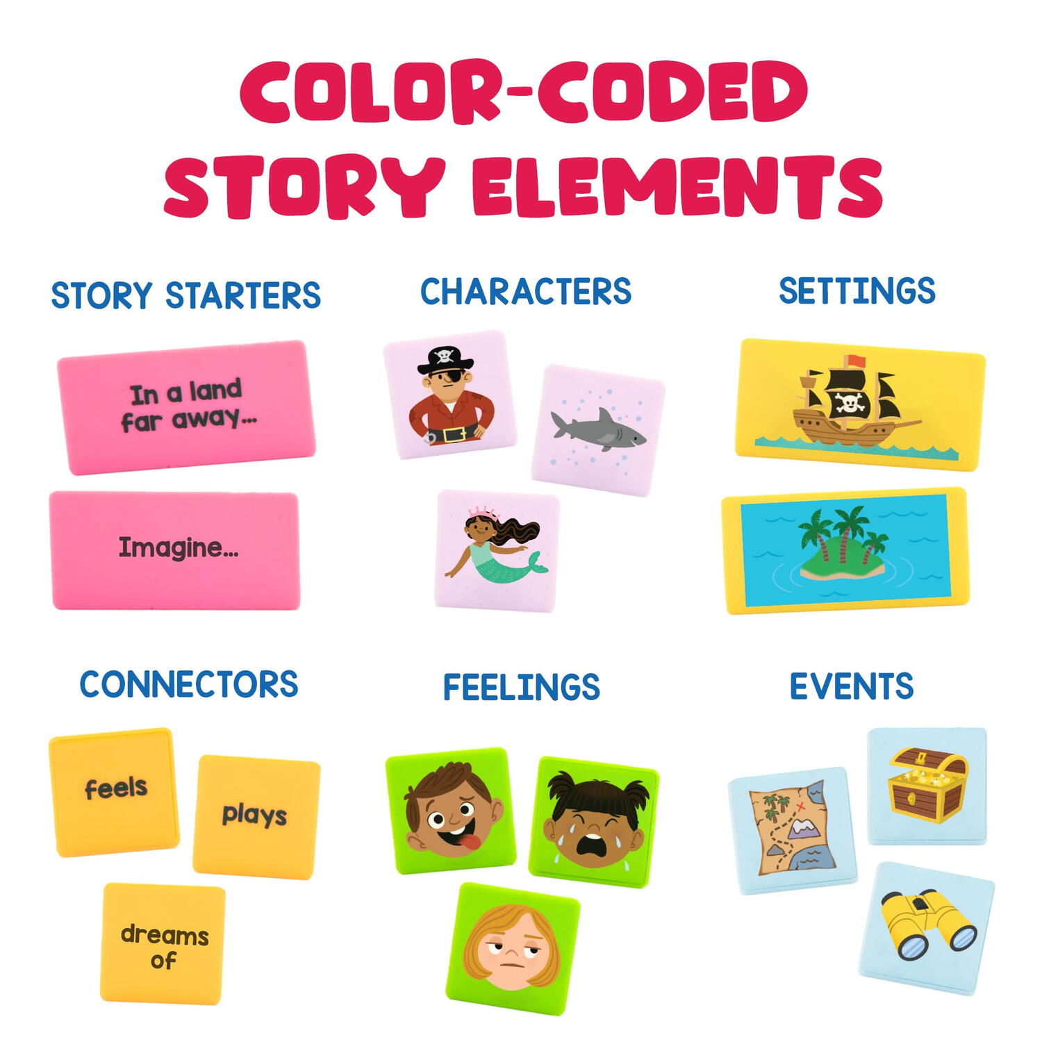 Fiecare categorie de elemente de poveste are propria culoare, pentru a ajuta copiii sa le deosebeasca usor atunci cand combina elementele pentru a construi povesti.