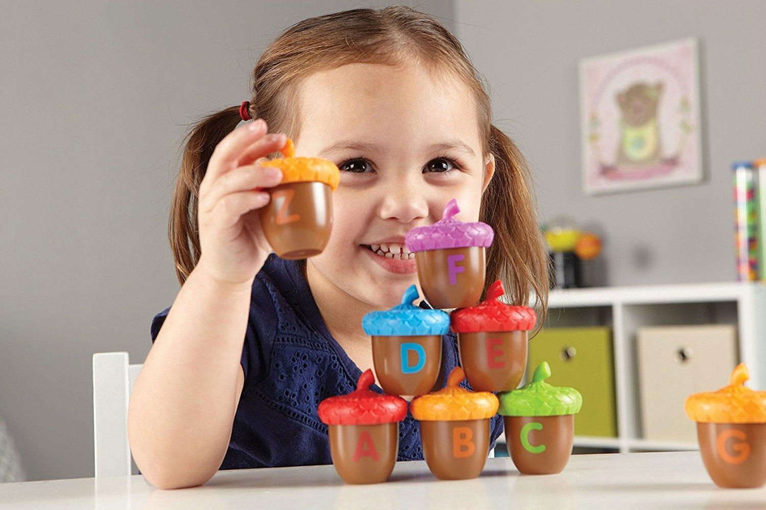 cei mici pot potrivi literele mari cu cele mici pe masura ce asambleaza ghindele si se pot bucura de un joc de tip „ascunde si gaseste”, descoperind o surpriza in interiorul fiecarei ghinde